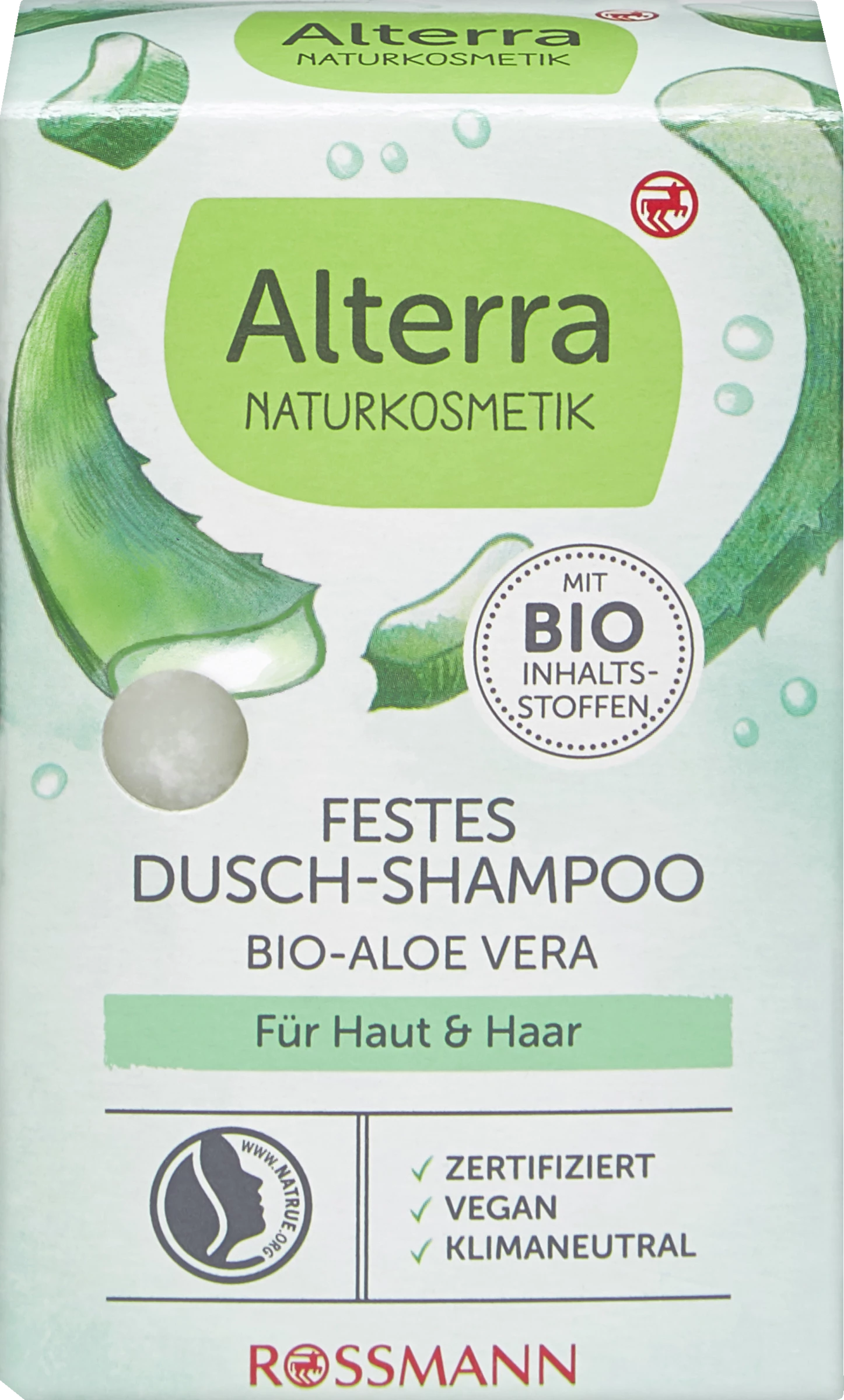 Doppelt gut gepflegt: Unser Alterra Festes Dusch-Shampoo 2in1 ist unsere komplett pH-neutrale von-Kopf-bis-Fuß-Pflege. Mit Bio-Aloe Vera, Bio-Kakaobutter und Bio-Sheabutter für streichelzarte Haut und Mandelöl und Bio-Olivenöl für eine glatte Haarstruktur.