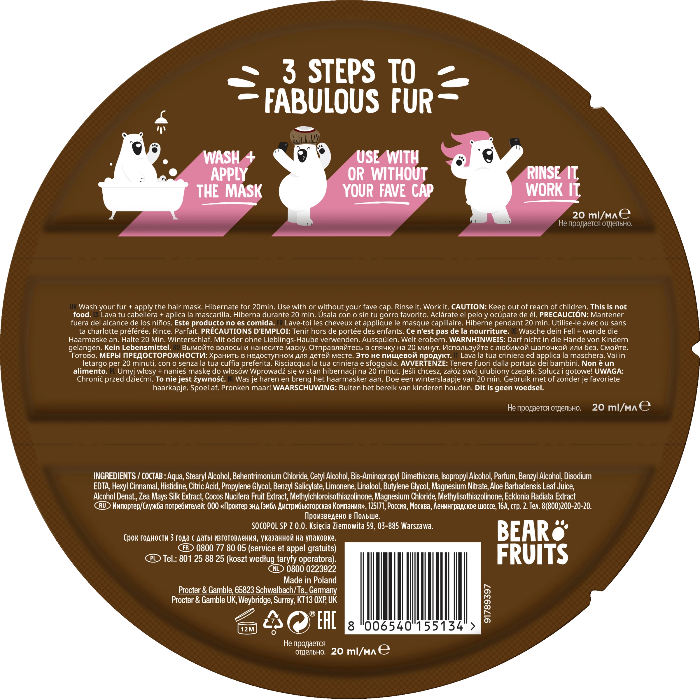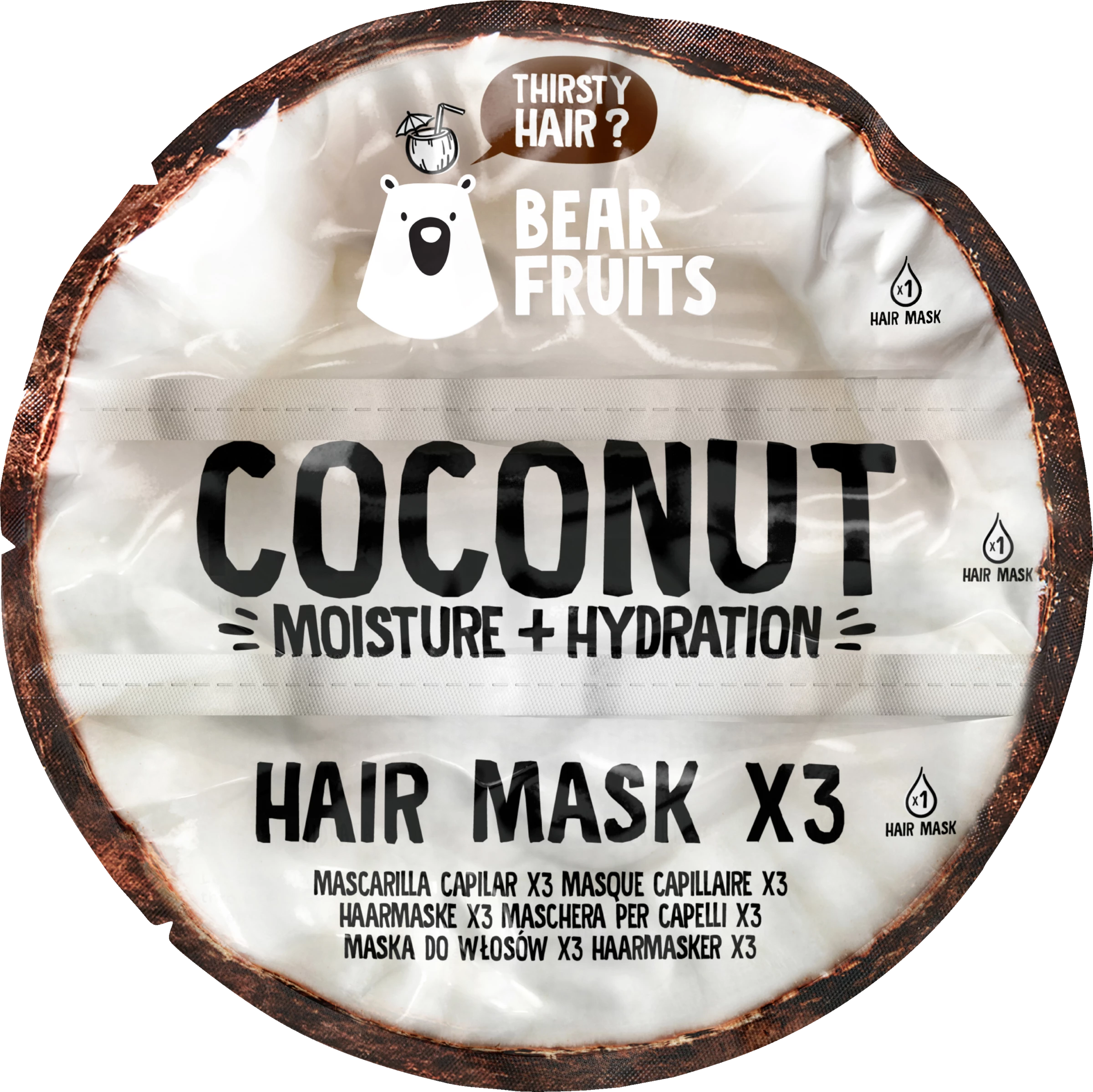 Jetzt unser Bear Fruits Coconut Nachfüllpack für 3 Anwendungen entdecken. Die Bear Fruits Feuchtigkeit + Hydration Haarmaske mit Kokosnuss-Extrakt versorgt das Haar bis in die Spitzen mit Feuchtigkeit und verleiht einen weichen und glänzenden Look. Lächeln, während die Haarmaske das Haar verwöhnt. Für beste Ergebnisse zusammen mit einer Bear Fruits Haube verwenden. Bear Fruits ist von PETA als cruelty-free zertifiziert! Außerdem sind unsere Kokosnuss-Haarmasken vegan.