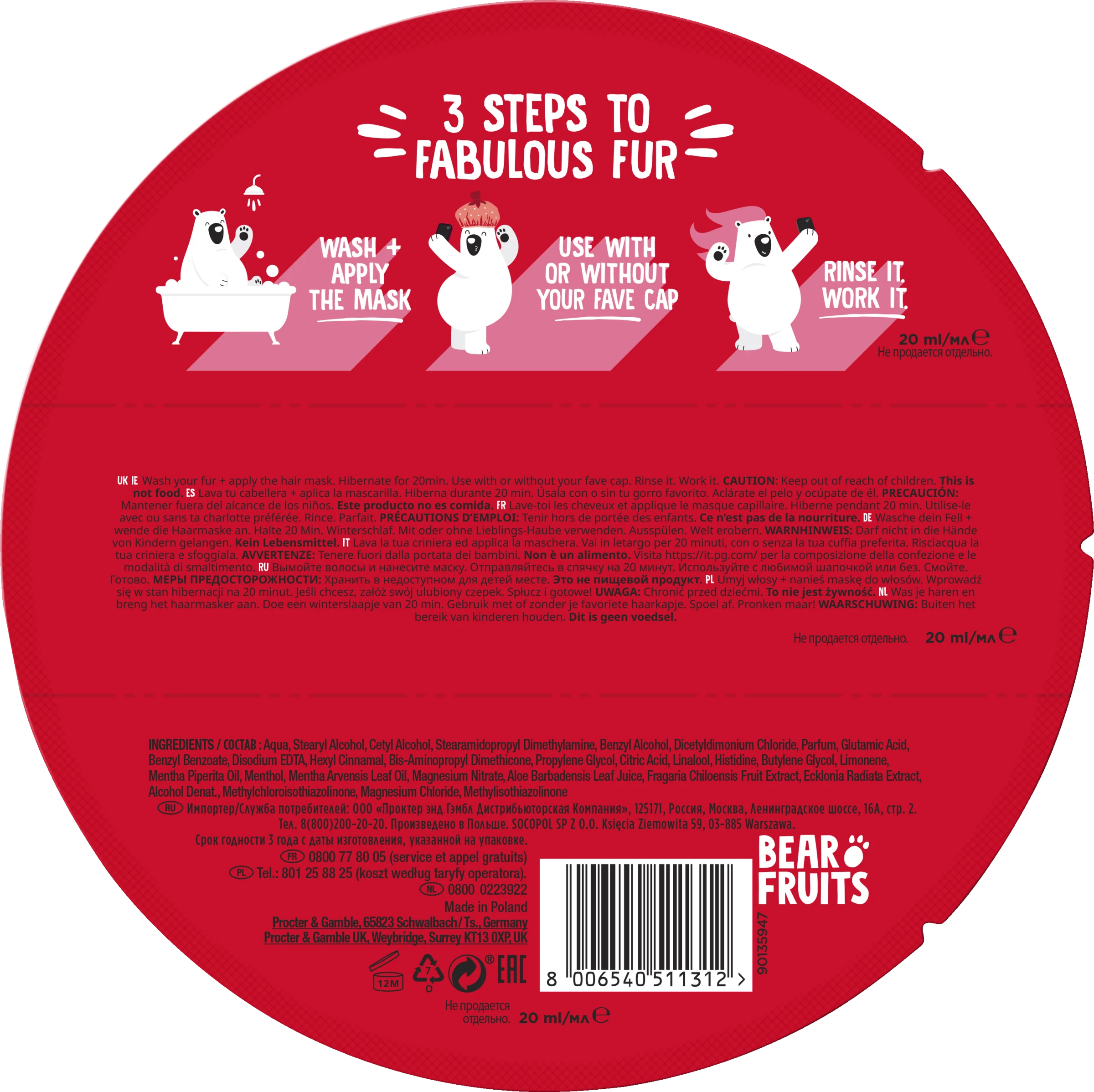 Die Bear Fruits Strawberry Entwirren + Glanz Haarmaske belebt müde Strähnen und verleiht stumpfen Locken einen himmlischen Glanz. Diese Haarmaske steckt voller Erdbeer-Extrakte und verleiht dem Haar einen Hauch von Sommer. Wie eine Gesichtsmaske, nur für das Haar! Verwende diese fruchtastische Maske als Teil der Haarpflegeroutine. Einfach die Haube aufsetzen und lächeln, während die Haarmaske das Haar verwöhnt.