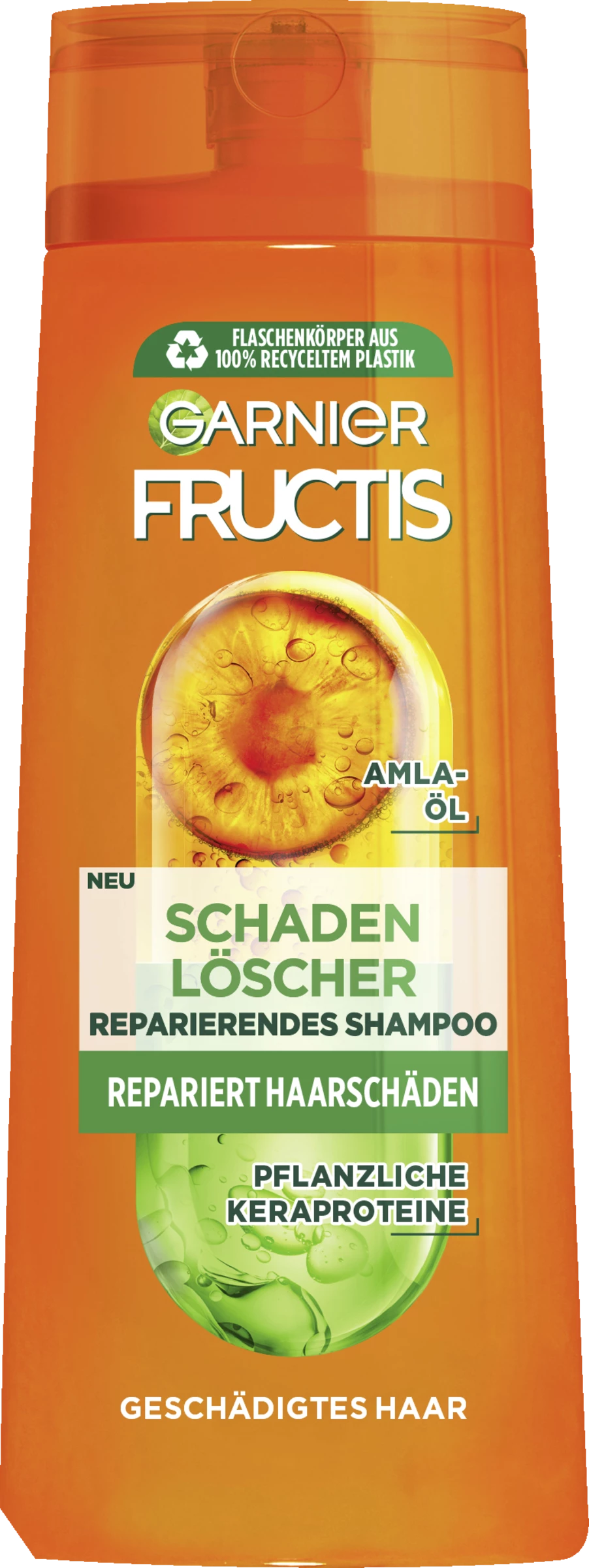 Stark geschädigtes Haar braucht intensive Pflege. Genau das bietet Garnier Fructis Schaden Löscher Kräftigendes Shampoo. Es vereint Amla-Öl und reparierendes Keraphyll, um selbst kleinste Haarschäden an der Haaroberfläche zu reparieren, die durch externe Einflüsse (z.B. Glätten, Föhnen, Färben) entstehen können. Gleichzeitig wird das Haar vor weiteren Schäden geschützt: Die Formel dringt tief in die Haarfaser ein und füllt Risse im Haar auf – die Haaroberfläche wird versiegelt und somit widerstandsfähiger. Das Ergebnis: Das Haar ist wunderbar glänzend und geschmeidig, hat weniger Spliss und die Längen sind kräftiger.