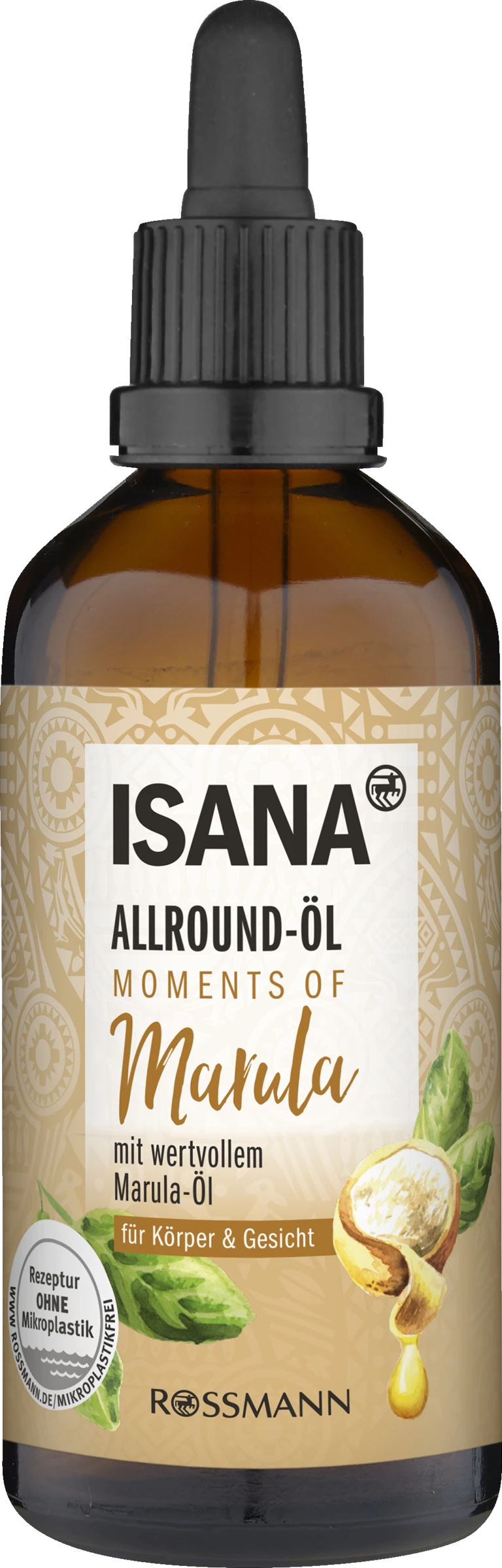 Moments of Marula – eine Schönheitskur für den ganzen Körper inspiriert von traditionellen afrikanischen Schönheitsritualen. Mit seiner einzigartigen Wirkformel aus wertvollem Marula-Öl, Mandelöl und Vitamin E sorgt das ISANA ALLROUND-ÖL für ein unvergleichbar zartes Hautgefühl. Das leichte Öl zieht besonders schnell ein und hinterlässt keinen störenden Fettfilm auf der Haut. Für alle Hauttypen geeignet. Diese Rezeptur ist zu 100% ohne Mikroplastik. Hautverträglichkeit dermatologisch bestätigt.