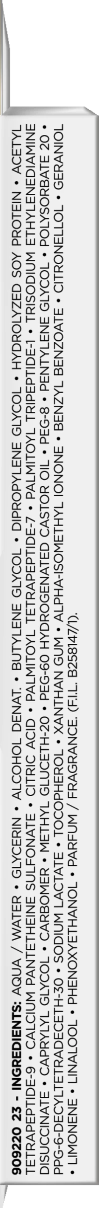 AQUA / WATER • GLYCERIN • ALCOHOL DENAT. • BUTYLENE GLYCOL • DIPROPYLENE GLYCOL • HYDROLYZED SOY PROTEIN • ACETYL TETRAPEPTIDE-9 • CALCIUM PANTETHEINE SULFONATE • CITRIC ACID • PALMITOYL TETRAPEPTIDE-7 • PALMITOYL TRIPEPTIDE-1 • TRISODIUM ETHYLENEDIAMINE DISUCCINATE • CAPRYLYL GLYCOL • CARBOMER • METHYL GLUCETH-20 • PEG-60 HYDROGENATED CASTOR OIL • PEG-8 • PENTYLENE GLYCOL • POLYSORBATE 20 • PPG-6-DECYLTETRADECETH-30 • SODIUM LACTATE • TOCOPHEROL • XANTHAN GUM • ALPHA-ISOMETHYL IONONE • BENZYL BENZOATE • CITRONELLOL • GERANIOL • LIMONENE • LINALOOL • PHENOXYETHANOL • PARFUM / FRAGRANCE (F.I.L. B258147/1).