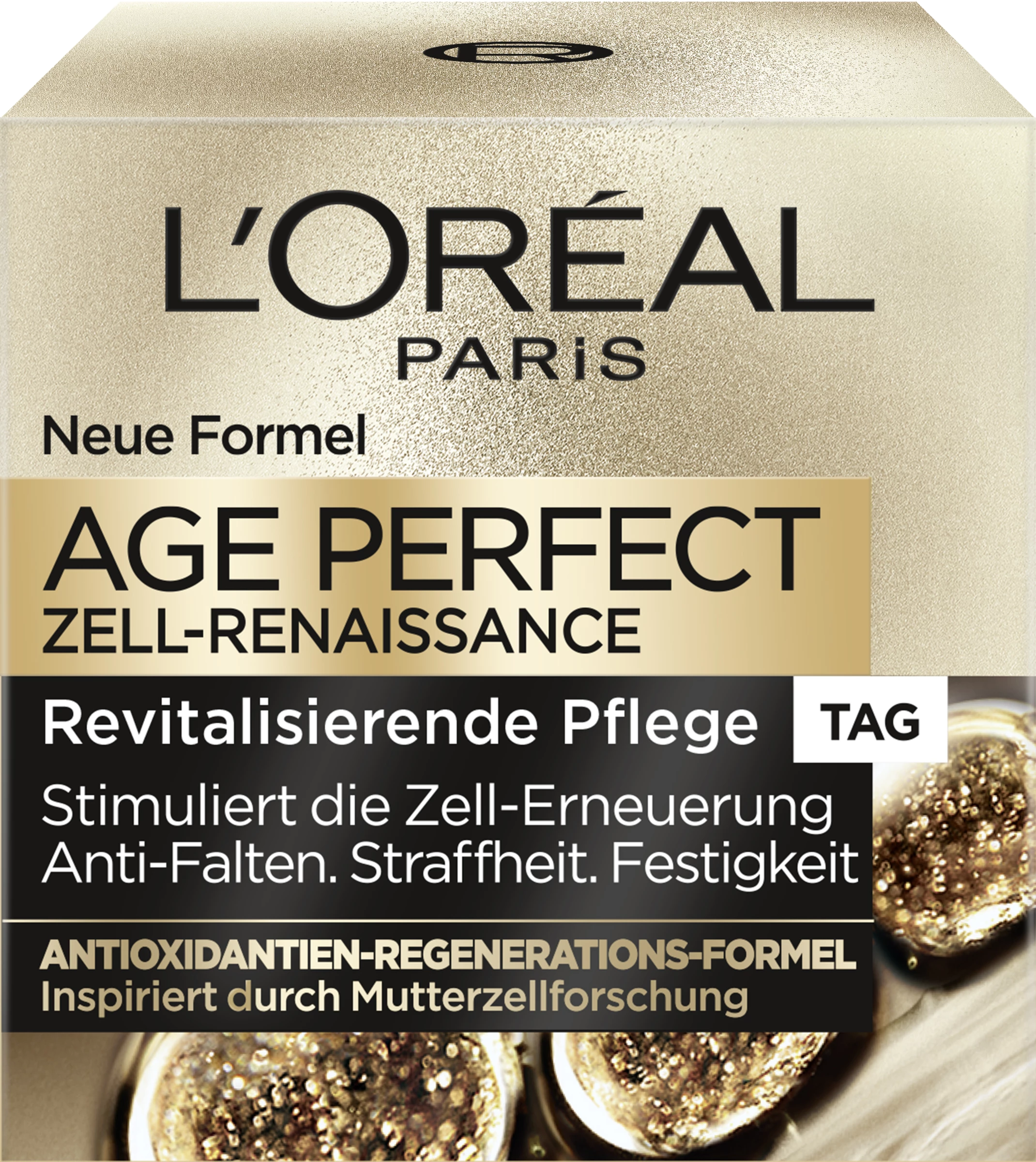 Die L’ORÉAL PARIS Labore haben das Geheimnis strahlend-schöner Haut entdeckt und die intensiv-regenerierende Pflegeserie Zell-Renaissance speziell für die Bedürfnisse reifer Haut entwickelt. Die Formel mit wertvollem schwarzen Trüffel und fermentiertem Schwarztee stimuliert die Zell-Erneuerung und verlängert die Hautvitalität. Jahr für Jahr verlangsamt sich die Zell-Erneuerung der Haut. Weniger neue Zellen werden gebildet und die Haut verliert an Vitalität. Die L’Oréal Paris Age Perfect Zell-Renaissance Tagespflege stimuliert die Zell-Erneuerung und Tiefen-Regeneration der Haut. Die Haut wird intensiv regeneriert, fester und straffer. Die festigende Kraft von Pro-Calcium verleiht der Haut neues Leben.