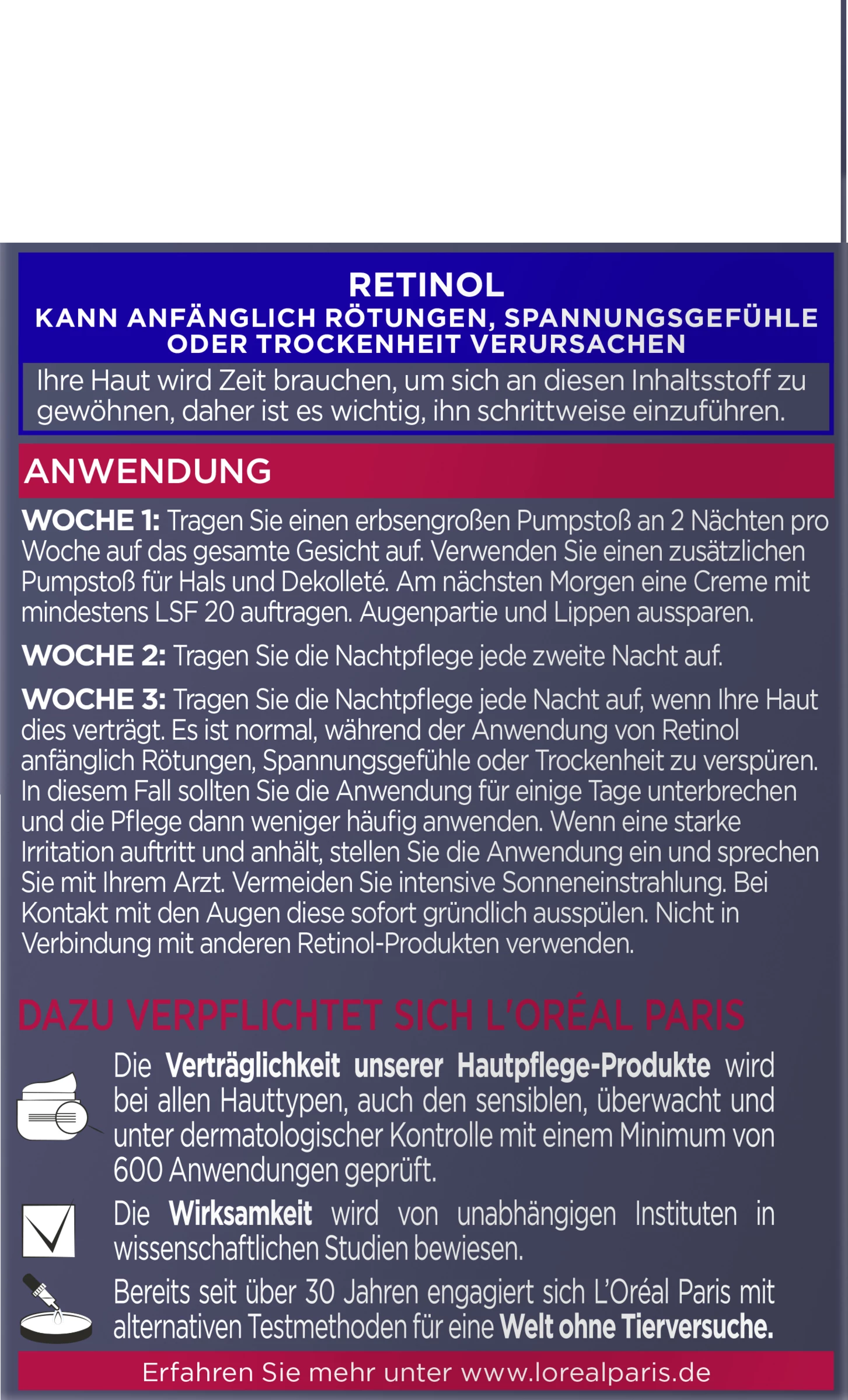 Die Revitalift Laser Gepresste Anti-Falten Pflege Nacht mit Retinol + Niacinamid von L’Oréal Paris mildert sichtbar Falten und korrigiert zugleich ein unebenmäßiges Hautbild. Dank enthaltenem Retinol [Vitamin A], ein von Dermatologen empfohlener Wirkstoff, wird den sichtbaren Anzeichen der Hautalterung effektiv entgegengewirkt. Niacinamid ist ein essenzieller Wirkstoff, der die Haut pflegt und durch seine aufhellenden Eigenschaften für einen gleichmäßigen Hautton sorgt. Die innovative Press-Tiegel-Technologie sorgt für eine hygienische Anwendung und leichte Dosierung. Nach einer Nacht fühlt sich die Haut intensiv mit Feuchtigkeit versorgt und genährt an. Nach 14 Nächten werden Falten sichtbar gemildert. Der Teint ist ebenmäßiger. Die Haut am Hals ist straffer. In 4 Wochen verbessern sich die Faltenmilderung und die Ebenmäßigkeit des Hauttons weiter. Die Haut ist glatter und strahlender.