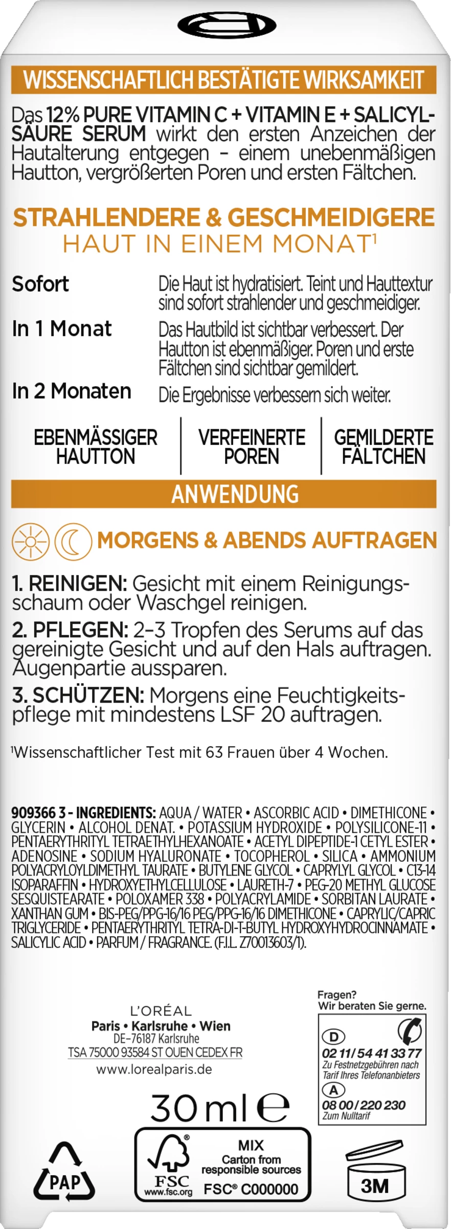 Das 12% PURE VITAMIN C + VITAMIN E + SALICYLSÄURE SERUM wirkt den ersten Anzeichen der Hautalterung entgegen – einem unebenmäßigen Hautton, vergrößerten Poren und ersten Fältchen.
