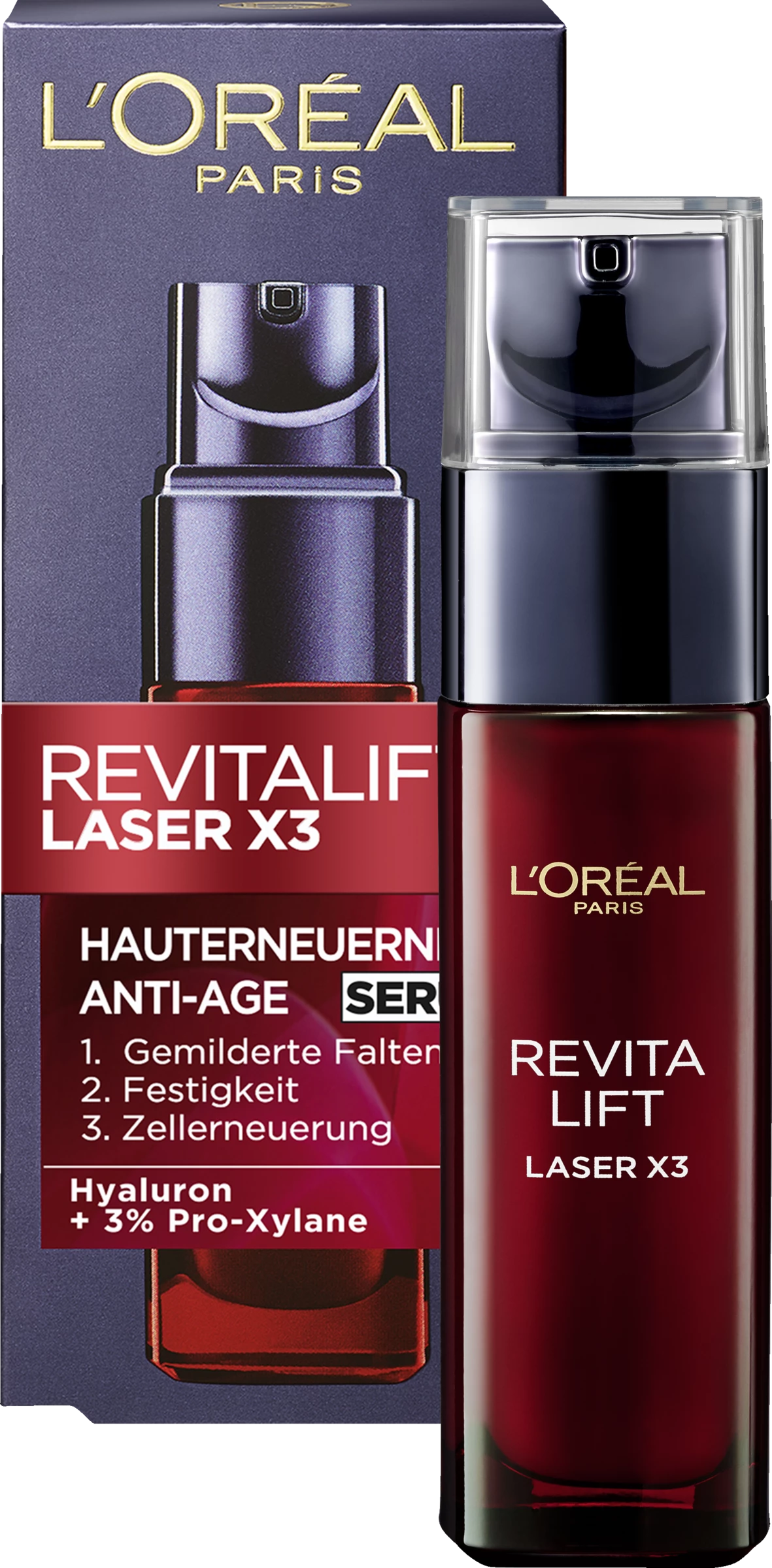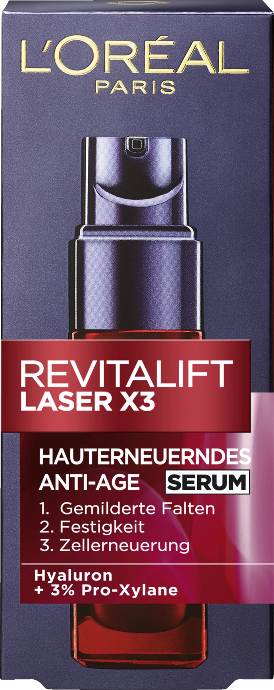 Entdecken Sie die tiefenwirksame Anti-Age Kraft: Revitalift Laser X3 Serum ist angereichert mit einer hohen Konzentration an Wirkstoffen für eine 3-fach Anti-Age Wirkung. L’Oréal Revitalift Laser X3 hochkonzentriertes Anti-Age Serum mildert sanft und sichtbar Falten und verfeinert nach und nach die Hautstruktur, indem sie nachhaltig gepflegt und wieder aufgebaut wird, so dass sie frisch und belebt erscheint.