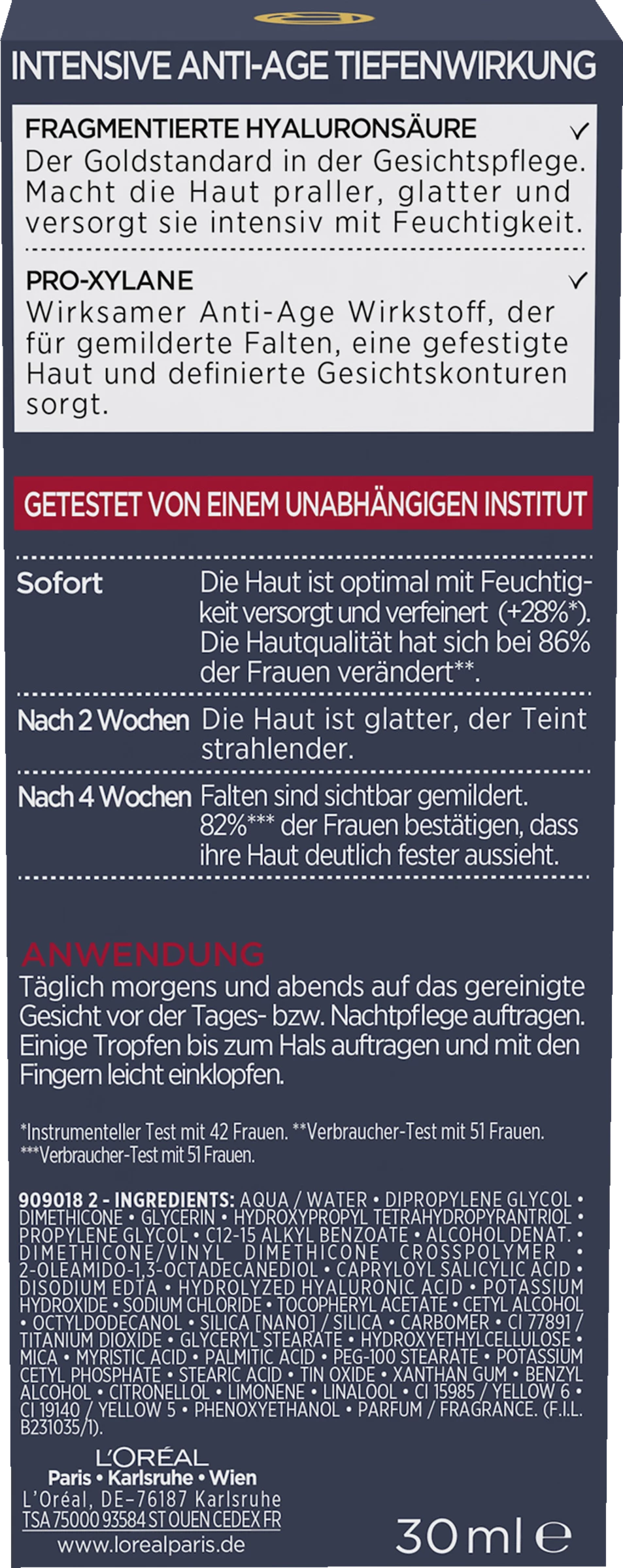 Täglich morgens und abends vor der täglichen Tages- oder Nachtpflege verwenden. Einige Tropfen auf dem gesamten Gesicht bis zum Hals auftragen.