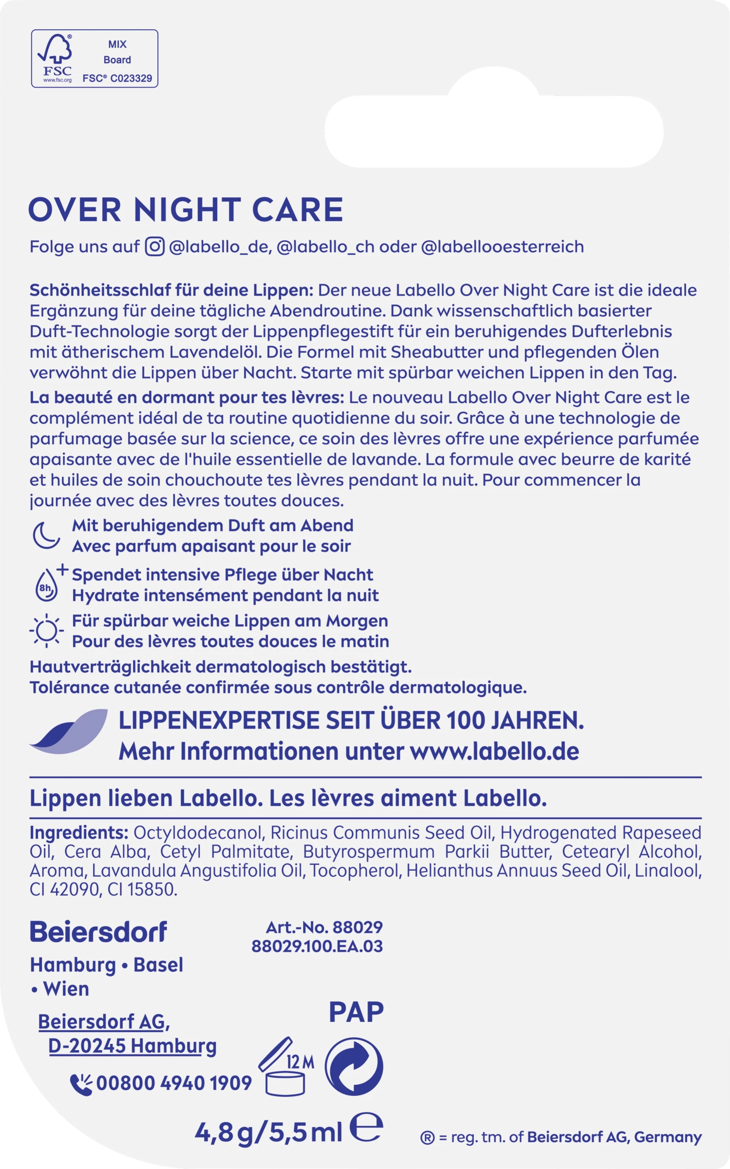Schönheitsschlaf für deine Lippen: Dein bewusster Ruhemoment vor dem Einschlafen mit dem neuen Labello Over Night Care! Die ideale Ergänzung für deine tägliche Abendroutine. Dank wissenschaftlich basierter Duft-Technologie sorgt der Lippenpflegestift für ein beruhigendes Dufterlebnis mit ätherischem Lavendelöl. Die Formel mit Sheabutter und pflegenden, natürlichen Ölen verwöhnt und beruhigt die Lippen über Nacht. Starte mit spürbarweichen und zart gepflegten Lippen in den Tag.