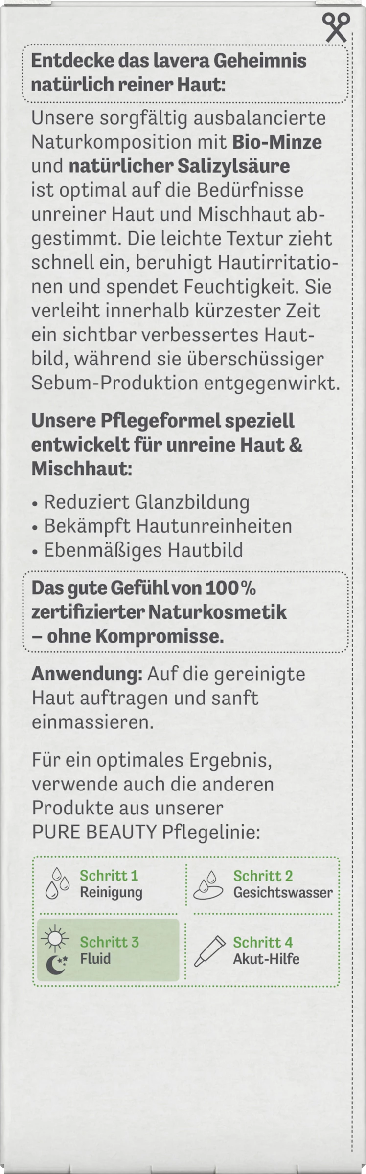 Entdecke das lavera Geheimnis natürlich reiner Haut: Ihre sorgfältig ausbalancierte Naturkomposition mit Bio-Minze und natürlicher Salizylsäure ist optimal auf die Bedürfnisse Unreiner Haut und Mischhaut abgestimmt. Die leichte Textur zieht schnell ein, beruhigt Hautirritationen und spendet Feuchtigkeit. Sie verleiht innerhalb kürzester Zeit ein sichtbar verbessertes Hautbild, während sie überschüssiger Sebum-Produktion entgegenwirkt. Ihre Pflegeformel speziell entwickelt für unreine Haut & Mischhaut: