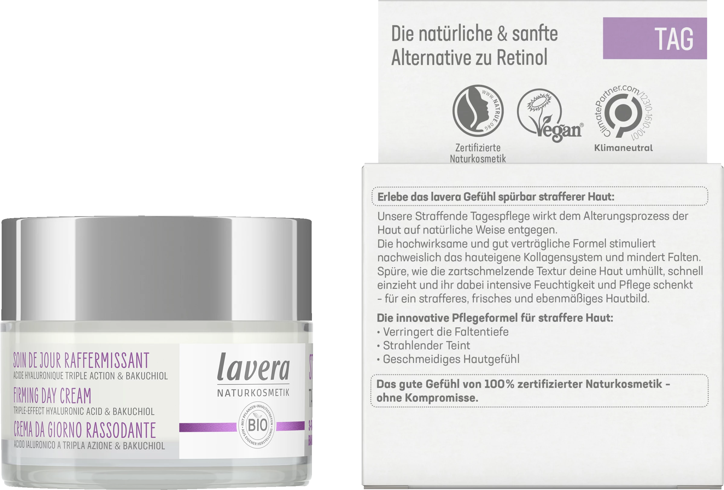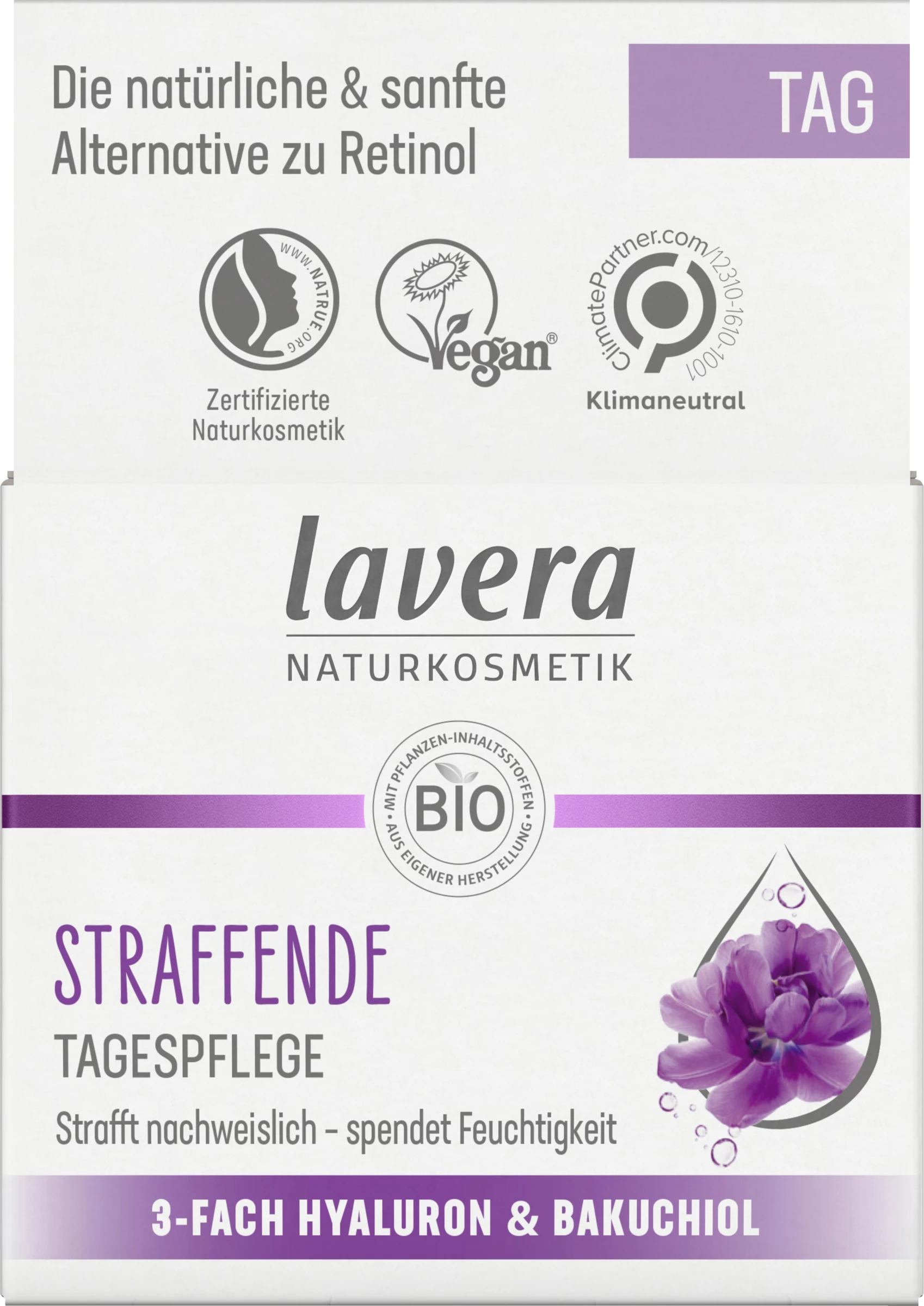 Erlebe das lavera Gefühl spürbar strafferer Haut. Die straffende Tagespflege mit 3-fach-Hyaluron & und dem Power-Wirkstoff Bakuchiol wirkt dem Alterungsprozess der Haut auf natürliche Weise entgegen. Die hochwirksame und gut verträgliche Formel stimuliert nachweislich das hauteigene Kollagensystem und mindert Falten. Spüre, wie die schnell einziehende Textur sanft mit deiner Haut verschmilzt und ihr dabei intensive Feuchtigkeit und Pflege schenkt – für ein strafferes, frisches und ebenmäßiges Hautbild.