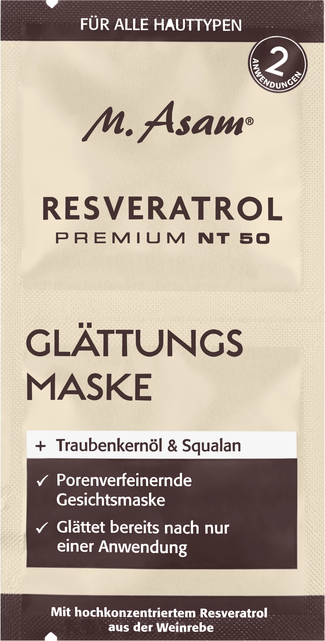 Diese Glättungsmaske enthält die exklusiv für M. Asam mit Resveratrol ausgestattete Navigationstechnologie NT50. Das hautverjüngende Resveratrol wird zielgenau an die Hautzellen geliefert und kann die Ausschüttung von Sirtuinen – den sogenannten Jugendlichkeitsenzymen – positiv beeinflussen. Die Haut wird von innen heraus in ihrem Erscheinungsbild verbessert. Die quervernetzte Hyaluronsäure lässt die Haut sofort praller erscheinen und unterstützt die intensive Durchfeuchtung der Haut. Die Maske von asambeauty glättet und entspannt die Haut sofort fühlbar. Linien und Fältchen können minimiert werden und die Haut wird in ihren natürlichen Regenerationsmechanismen unterstützt. Für jeden Hauttyp ab 35 geeignet.
