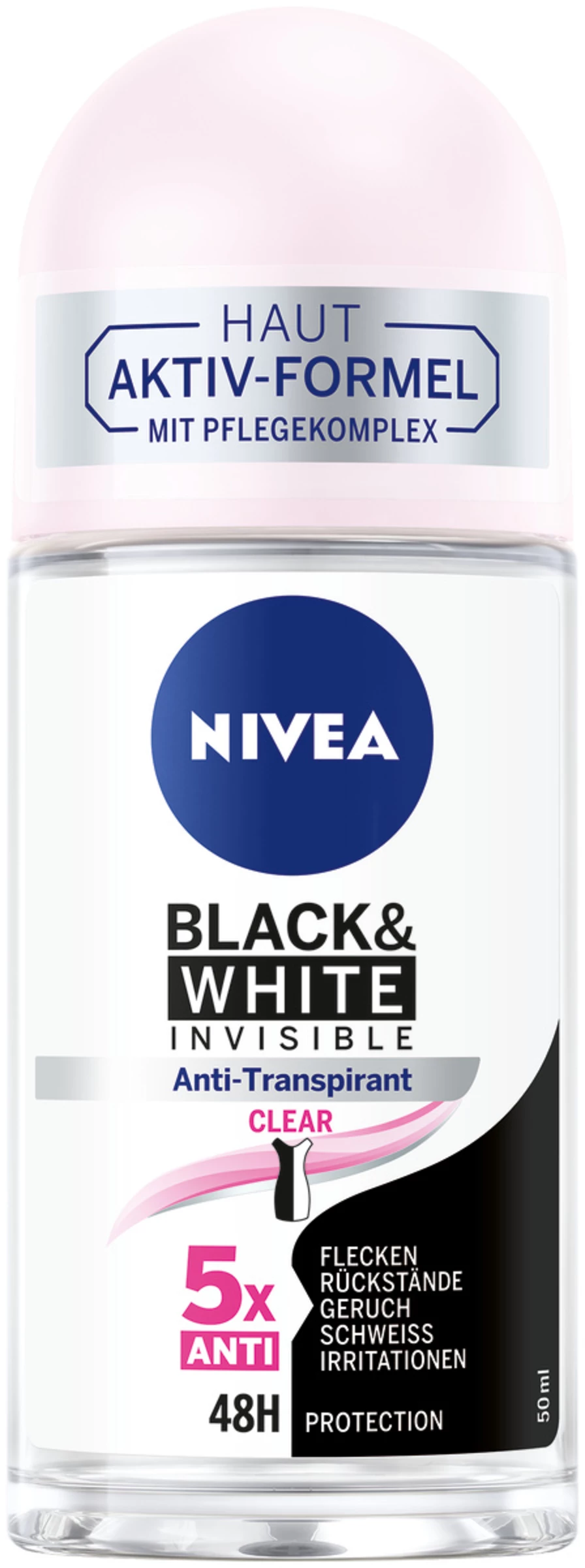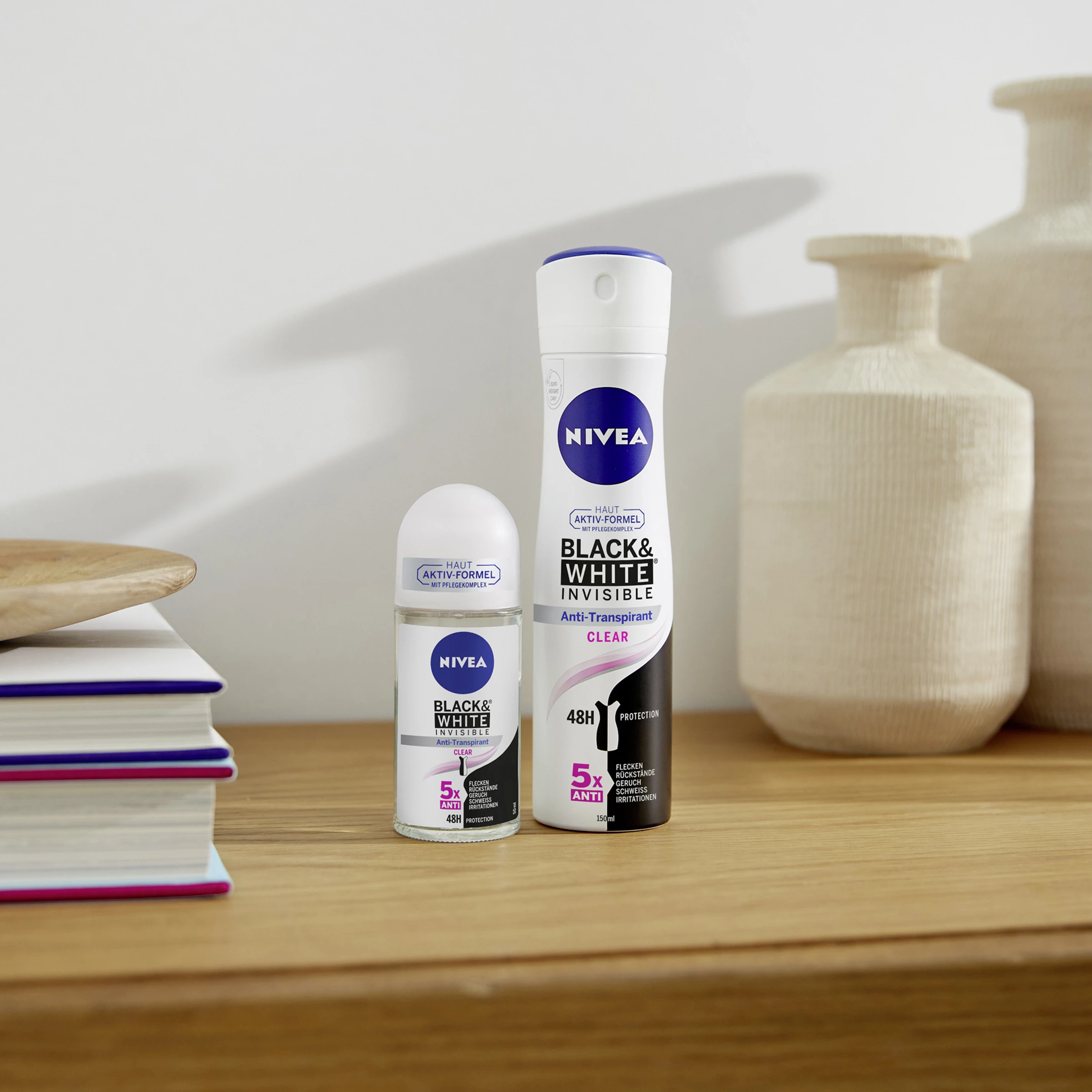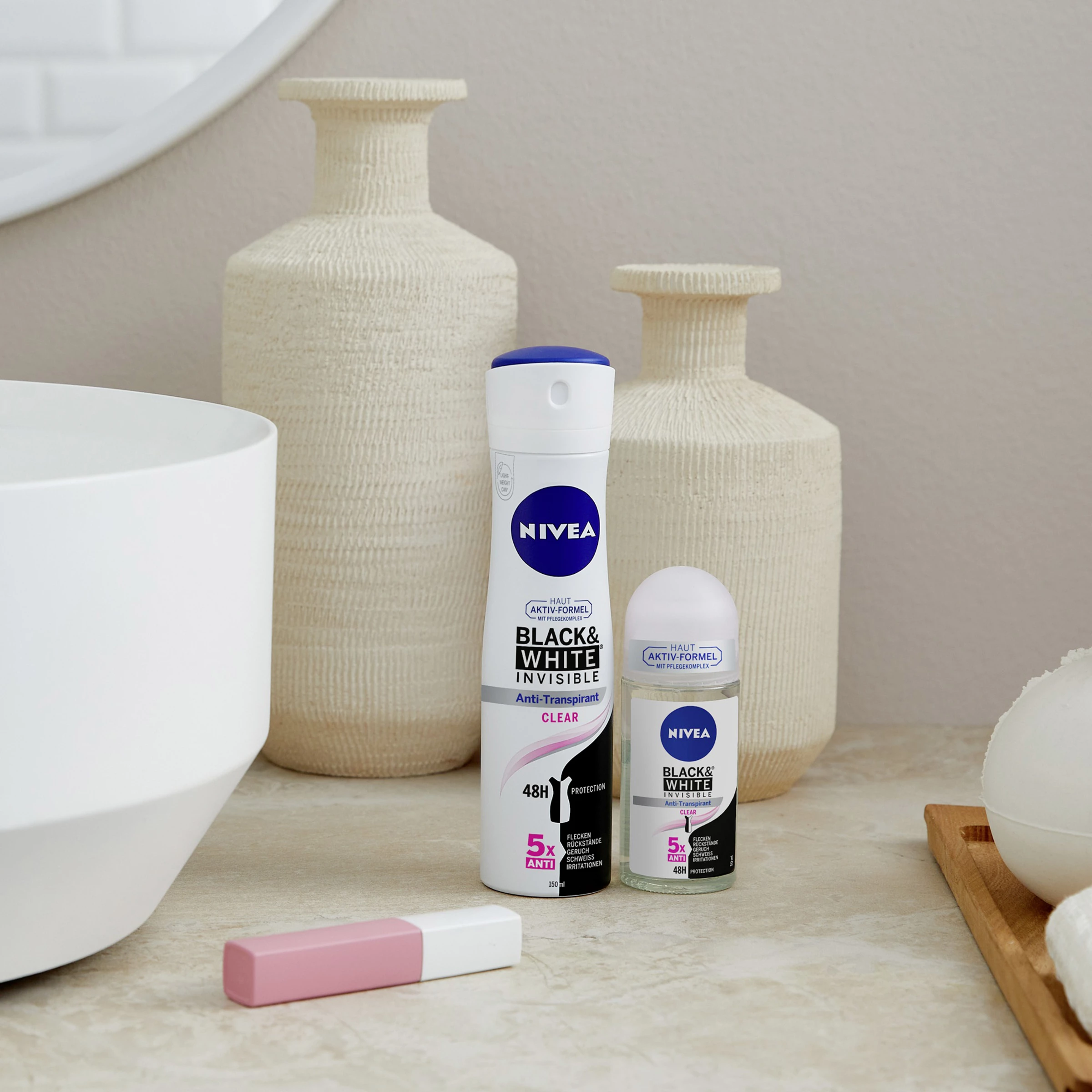 NIVEA Black & White Invisible Clear bietet Schutz vor Achselnässe und Körpergeruch – 48 Stunden lang. Die hochwirksame Formel schützt vor gelben Flecken auf weißer Kleidung und weißen Rückständen auf dunklen Textilien. Für Deo-Schutz, den man nicht sieht, aber fühlt.
