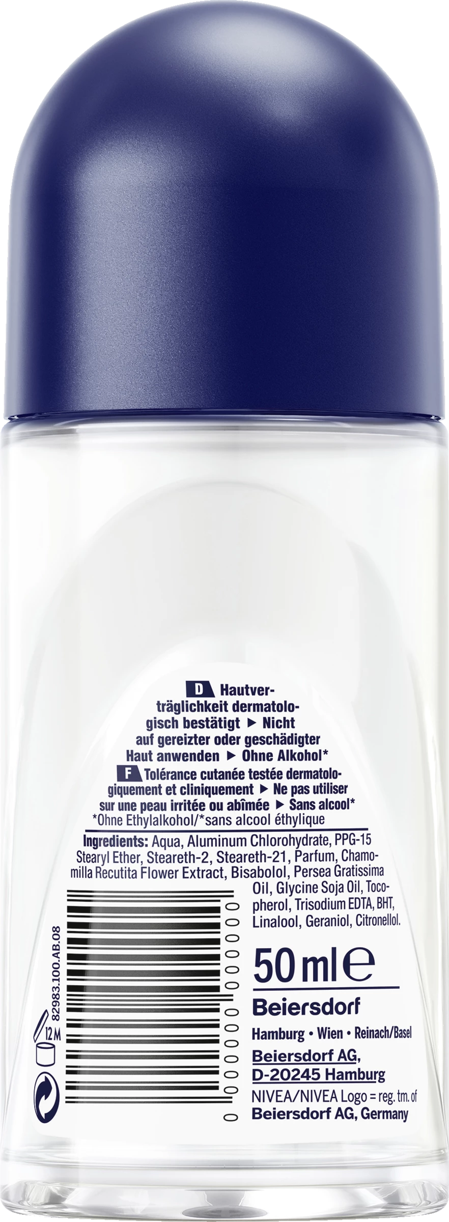 Aqua, Aluminum Chlorohydrate, PPG-15 Stearyl Ether, Steareth-2, Steareth-21, Parfum, Chamomilla Recutita Flower Extract, Bisabolol, Persea Gratissima Oil, Glycine Soja Oil, Tocopherol, Trisodium EDTA, BHT, Linalool, Geraniol, Citronellol