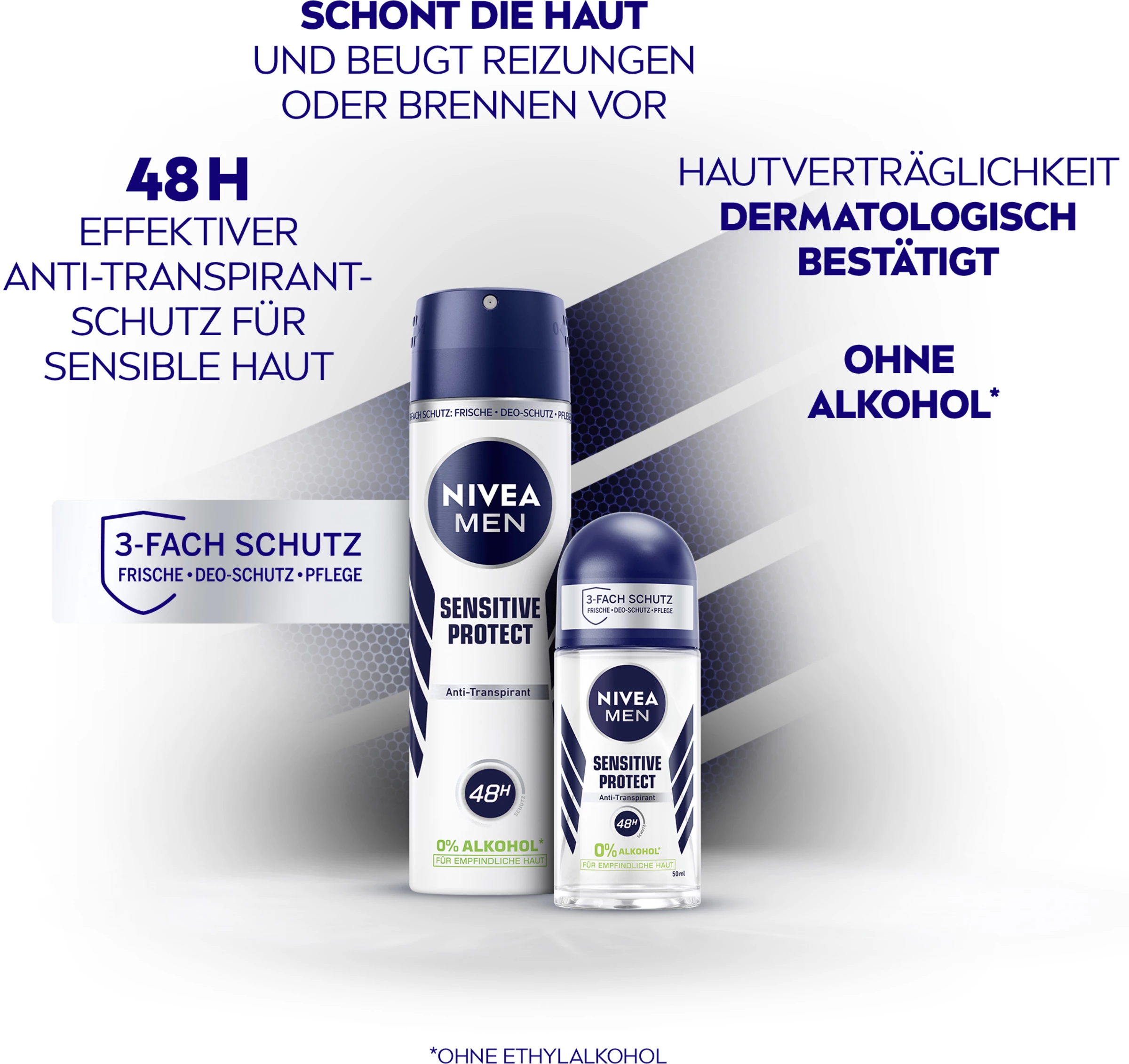 NIVEA MEN Sensitive Protect Deo Roll-On schützt empfindliche Haut 48 Stunden lang vor Achselnässe und Körpergeruch – Ohne Alkohol. Reizungen, Hautrötungen oder Brennen wird mit Hilfe des wertvollen Kamillenextrakts wirksam vorgebeugt. Der angenehme Duft kombiniert mit der bewährten sanften NIVEA Pflege.