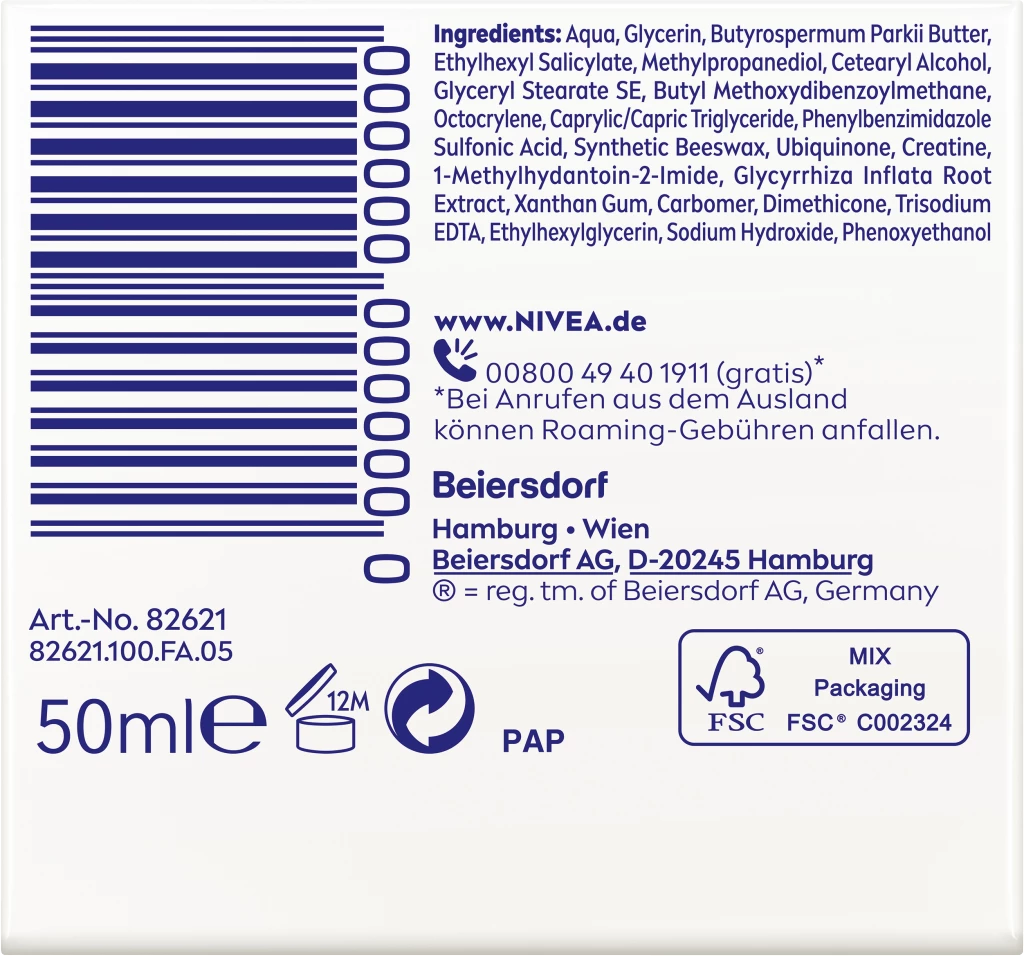 Aqua, Glycerin, Butyrospermum Parkii Butter, Ethylhexyl Salicylate, Methylpropanediol, Cetearyl Alcohol, Glyceryl Stearate SE, Butyl Methoxydibenzoylmethane, Octocrylene, Caprylic/Capric Triglyceride, Phenylbenzimidazole Sulfonic Acid, Synthetic Beeswax, Ubiquinone, Creatine, 1-Methylhydantoin-2-Imide, Glycyrrhiza Inflata Root Extract, Xanthan Gum, Carbomer, Dimethicone, Trisodium EDTA, Ethylhexylglycerin, Sodium Hydroxide, Phenoxyethanol