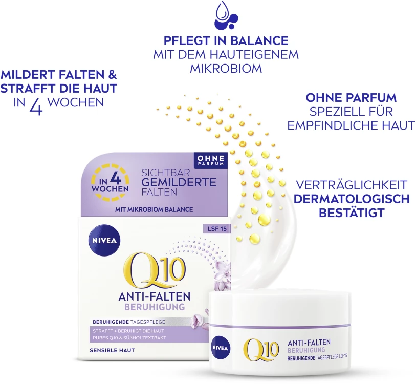 Die Q10 POWER ANTI-FALTEN + STRAFFUNG Tagespflege für sensible Haut mit 100% HAUTIDENTISCHEM Q10 mildert Falten sichtbar. Die sanfte Formel ist speziell für die Bedürfnisse sensibler Haut entwickelt und frei von Parfum und Ethyl Alkohol: Q10 POWER Anti-Falten + Beruhigung Tagespflege Sensitiv.