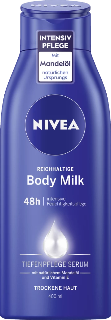 Für alle, die mehr als nur Feuchtigkeit von einer Body Lotion erwarten. Die NIVEA Body Milk bietet 3 in 1: 48h Pflege, Geschmeidigkeit und natürlich schöne Haut. Sie ist angereichert mit dem NIVEA TIEFENPFLEGE SERUM, natürlichem Mandelöl und Vitamin E für zarte und gepflegte Haut. Mit nur einer Anwendung versorgt die NIVEA Body Milk Ihre Haut 48h mit Feuchtigkeit und lindert das raue und trockene Hautgefühl. Für einen Effekt, den Sie nicht nur fühlen, sondern auch sehen können: NIVEA Reichhaltige Body Milk.