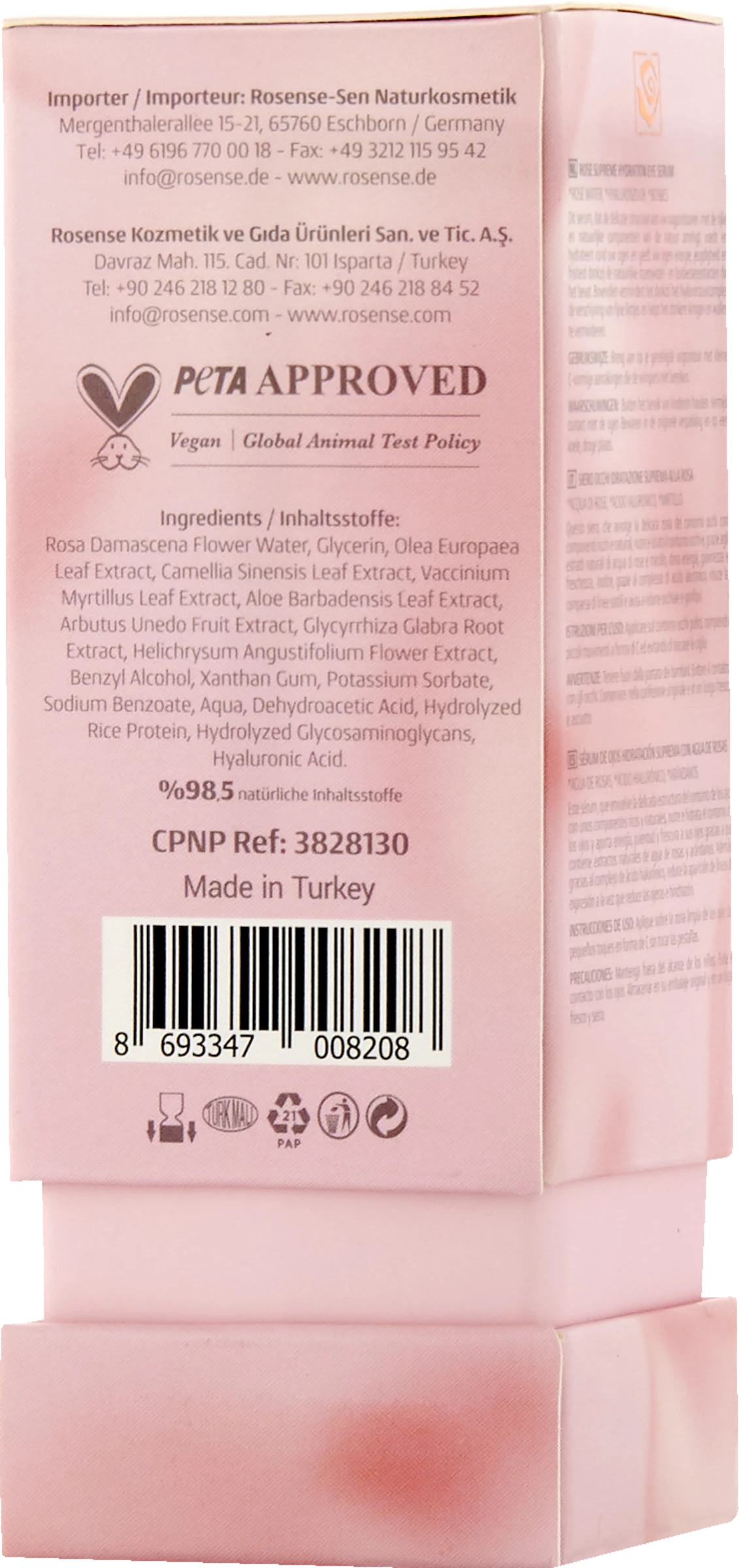 Rosa Damascena Flower Water, Glycerin, Olea Europaea Leaf Extract, Camellia Sinensis Leaf Extract, Vaccinium Myrtillus Leaf Extract, Aloe Barbadensis Leaf Extract, Arbutus Unedo Fruit Extract, Glycyrrhiza Glabra Root Extract, Helichrysum Angustifolium Flower Extract, Benzyl Alcohol, Xanthan Gum, Potassium Sorbate, Sodium Benzoate, Aqua, Dehydroacetic Acid, Hydrolyzed Rice Protein, Hydrolyzed Glycosaminoglycans, Hyaluronic Acid.