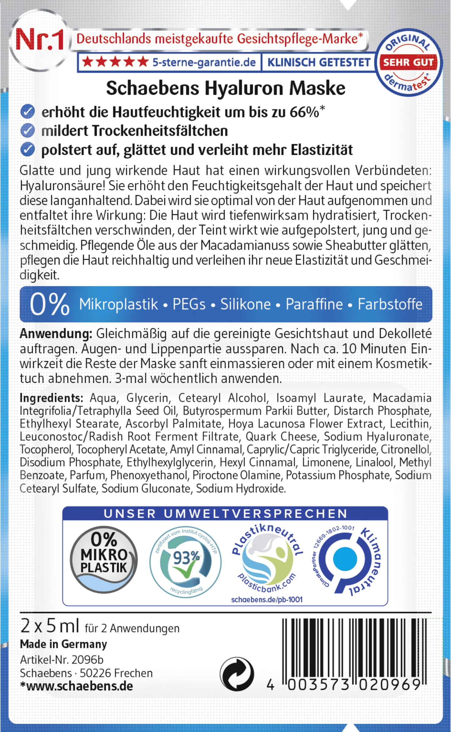 Glatte und jung wirkende Haut hat einen wirkungsvollen Verbündeten: Hyaluronsäure! Sie erhöht den Feuchtigkeitsgehalt der Haut und speichert diese langanhaltend. Dabei wird sie optimal von der Haut aufgenommen und entfaltet ihre Wirkung: Die Haut wird tiefenwirksam hydratisiert, Trockenheitsfältchen verschwinden, der Teint wirkt wie aufgepolstert, jung und geschmeidig. Die Kombination mit weiteren feuchtigkeitsspendenden Wirkstoffen macht aus dieser Creme Maske einen effektiven Hydro-Booster für die Haut. Pflegende Öle aus der Macadamianuss sowie Sheabutter glätten, pflegen die Haut reichhaltig und verleihen ihr neue Elastizität und Geschmeidigkeit.
