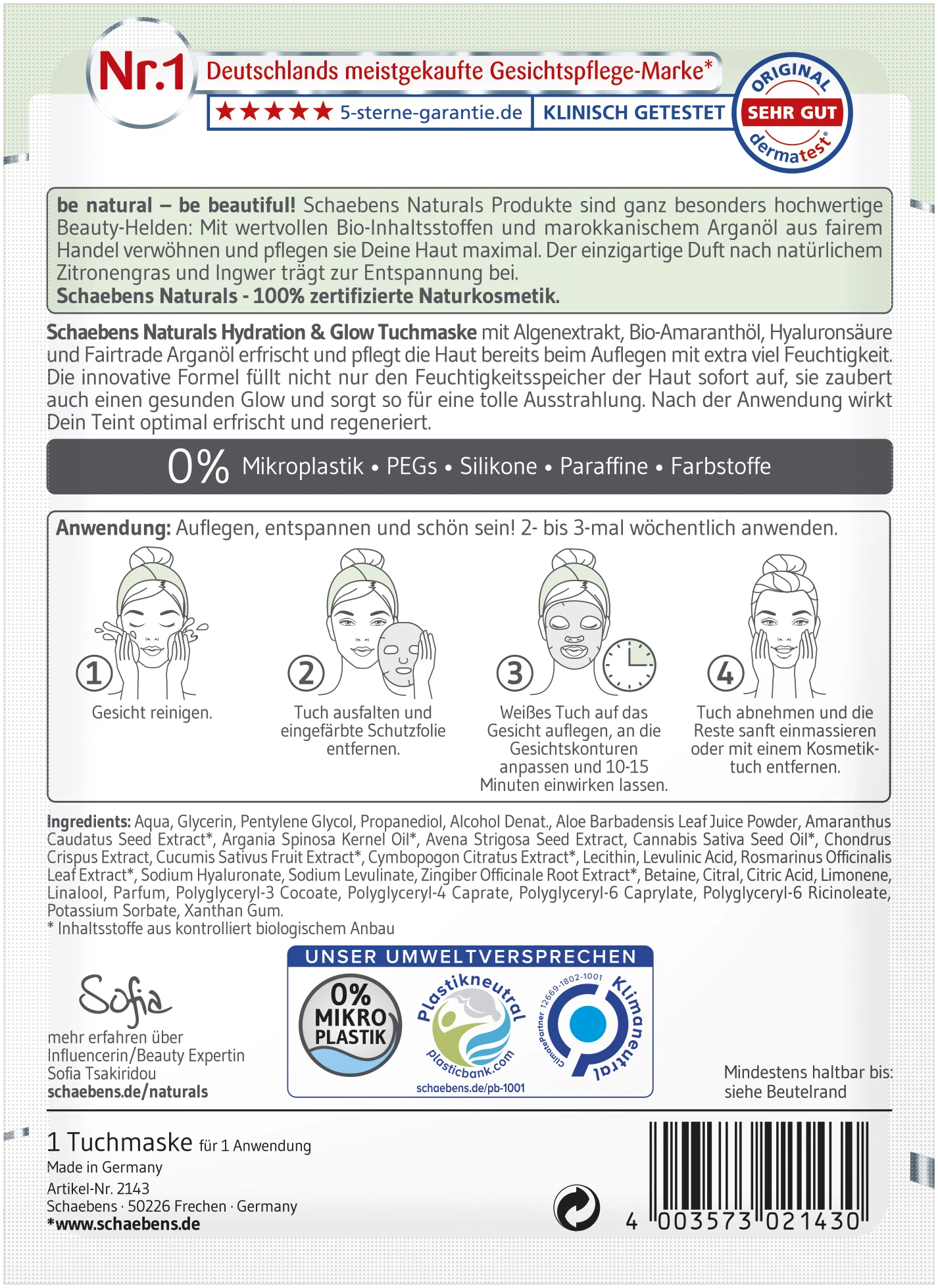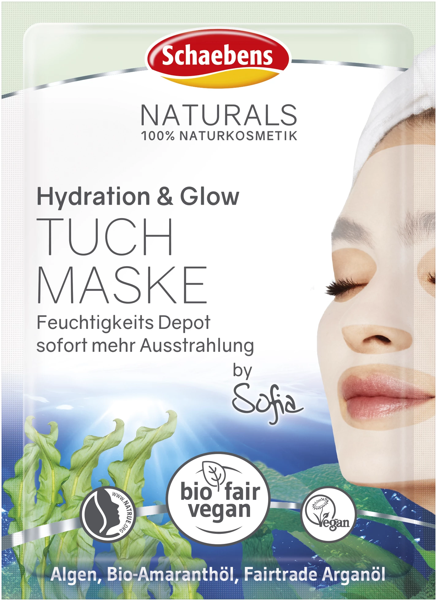 Feuchtigkeits Depot sofort mehr Ausstrahlung. Schaebens Naturals Hydration & Glow Tuchmaske mit Algenextrakt, Bio-Amaranthöl, Hyaluronsäure und Fairtrade Arganöl erfrischt und pflegt die Haut bereits beim Auflegen mit extra viel Feuchtigkeit. Die innovative Formel füllt nicht nur den Feuchtigkeitsspeicher der Haut sofort auf, sie zaubert auch einen gesunden Glow und sorgt so für eine tolle Ausstrahlung. Nach der Anwendung wirkt Dein Teint optimal erfrischt und regeneriert.