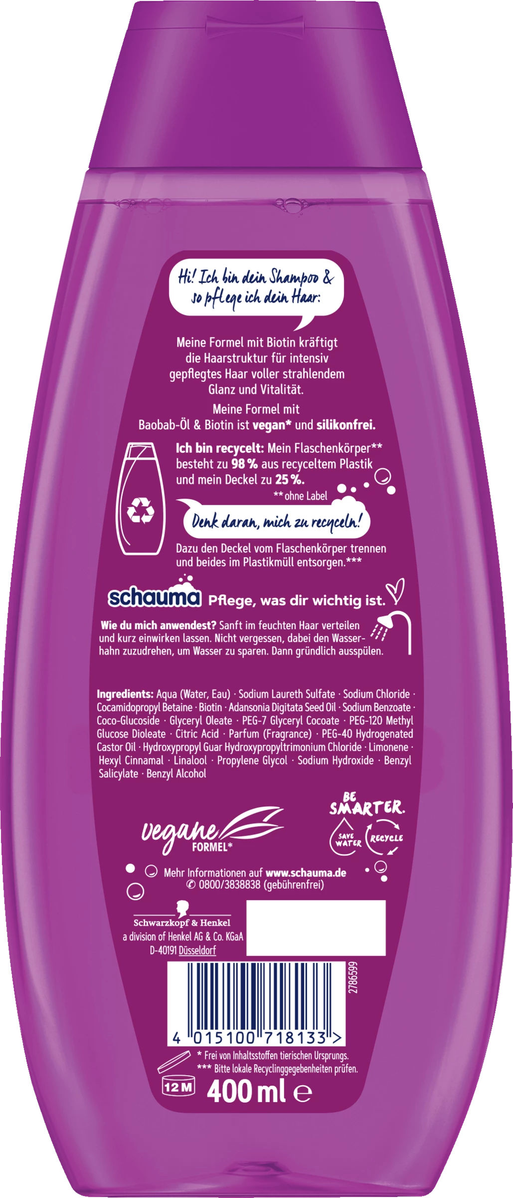 Aqua (Water, Eau), Sodium Laureth Sulfate, Sodium Chloride, Cocamidopropyl Betaine, Biotin, Adansonia Digitata Seed Oil, Sodium Benzoate, Coco-Glucoside, Glyceryl Oleate, PEG-7 Glyceryl Cocoate, PEG-120 Methyl Glucose Dioleate, Citric Acid, Parfum (Fragrance), PEG-40 Hydrogenated Castor Oil, Hydroxypropyl Guar Hydroxypropyltrimonium Chloride, Limonene, Hexyl Cinnamal, Linalool, Propylene Glycol, Sodium Hydroxide, Benzyl Salicylate, Benzyl Alcohol