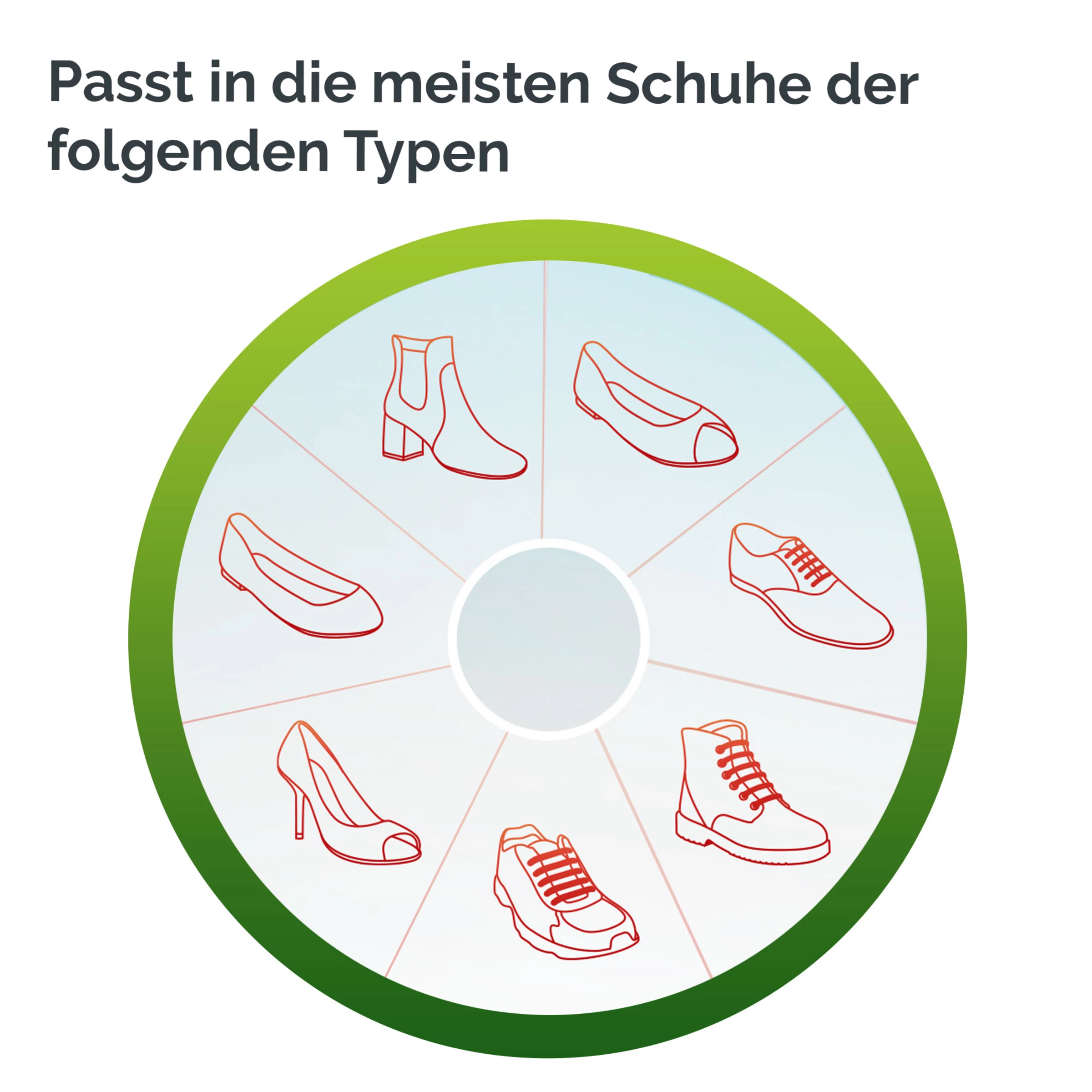 Achten Sie vor der Verwendung darauf, dass das Produkt gut in den Schuh passt. Das Ende der Einlegesohle sollte an der Zehenbasis sitzen, dies kann dazu führen, dass die Einlegesohle nicht bis an den hinteren Rand des Schuhs reicht.