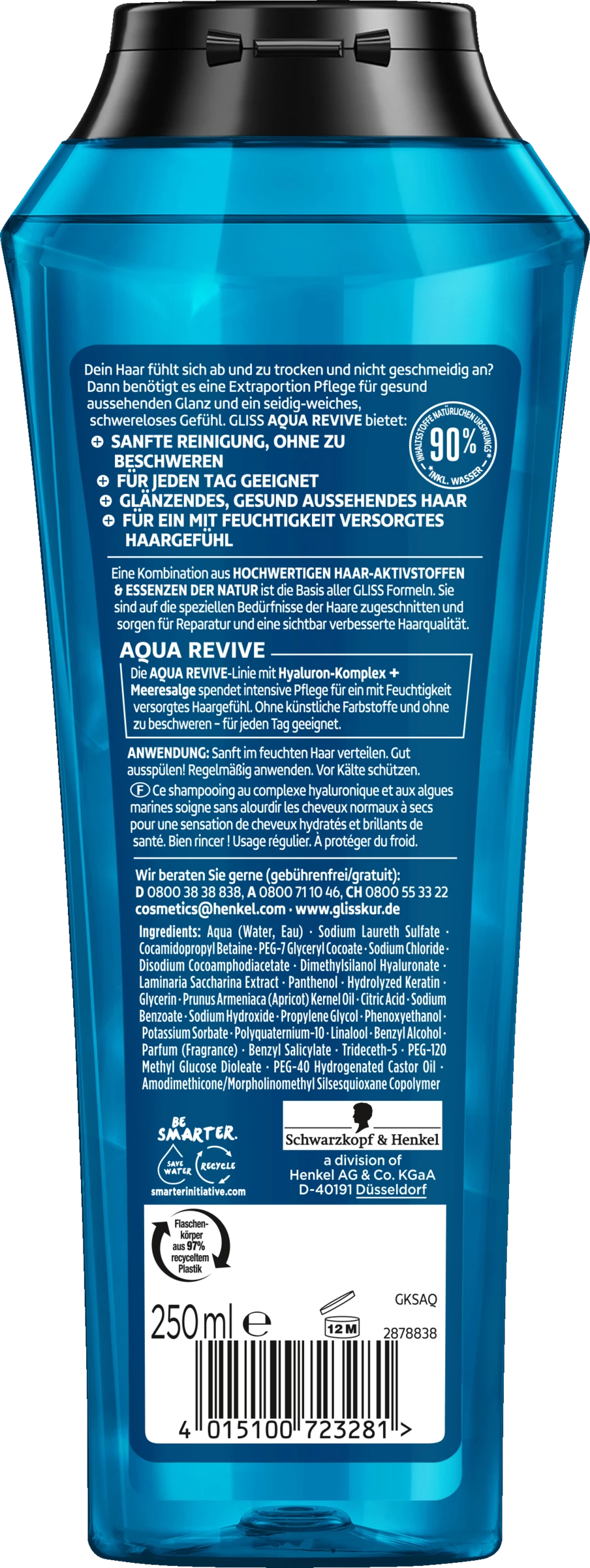 Aqua (Water, Eau), Sodium Laureth Sulfate, Cocamidopropyl Betaine, PEG-7 Glyceryl Cocoate, Sodium Chloride, Disodium Cocoamphodiacetate, Dimethylsilanol Hyaluronate, Laminaria Saccharina Extract, Panthenol, Hydrolyzed Keratin, Glycerin, Prunus Armeniaca (Apricot) Kernel Oil, Citric Acid, Sodium Benzoate, Sodium Hydroxide, Propylene Glycol, Phenoxyethanol, Potassium Sorbate, Polyquaternium-10, Linalool, Benzyl Alcohol, Parfum (Fragrance), Benzyl Salicylate, Trideceth-5, PEG-120 Methyl Glucose Dioleate, PEG-40 Hydrogenated Castor Oil, Amodimethicone/Morpholinomethyl Silsesquioxane Copolymer.