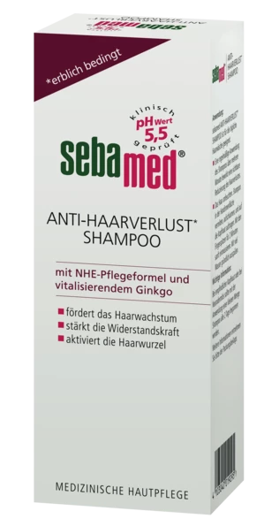 sebamed Anti-Haarverlust* Shampoo ist für die tägliche Haarwäsche geeignet. Eine regelmäßige Anwendung des Shampoos über mehrere Monate bewirkt eine sichtbare Reduzierung des Haarverlustes. Das Haar anfeuchten. Shampoo in die Handinnenfläche verreiben, aufschäumen, und auf die Kopfhaut auftragen. Mit den Fingerspitzen für 2 Minuten sanft einmassieren. Mit viel Wasser gründlich ausspülen.