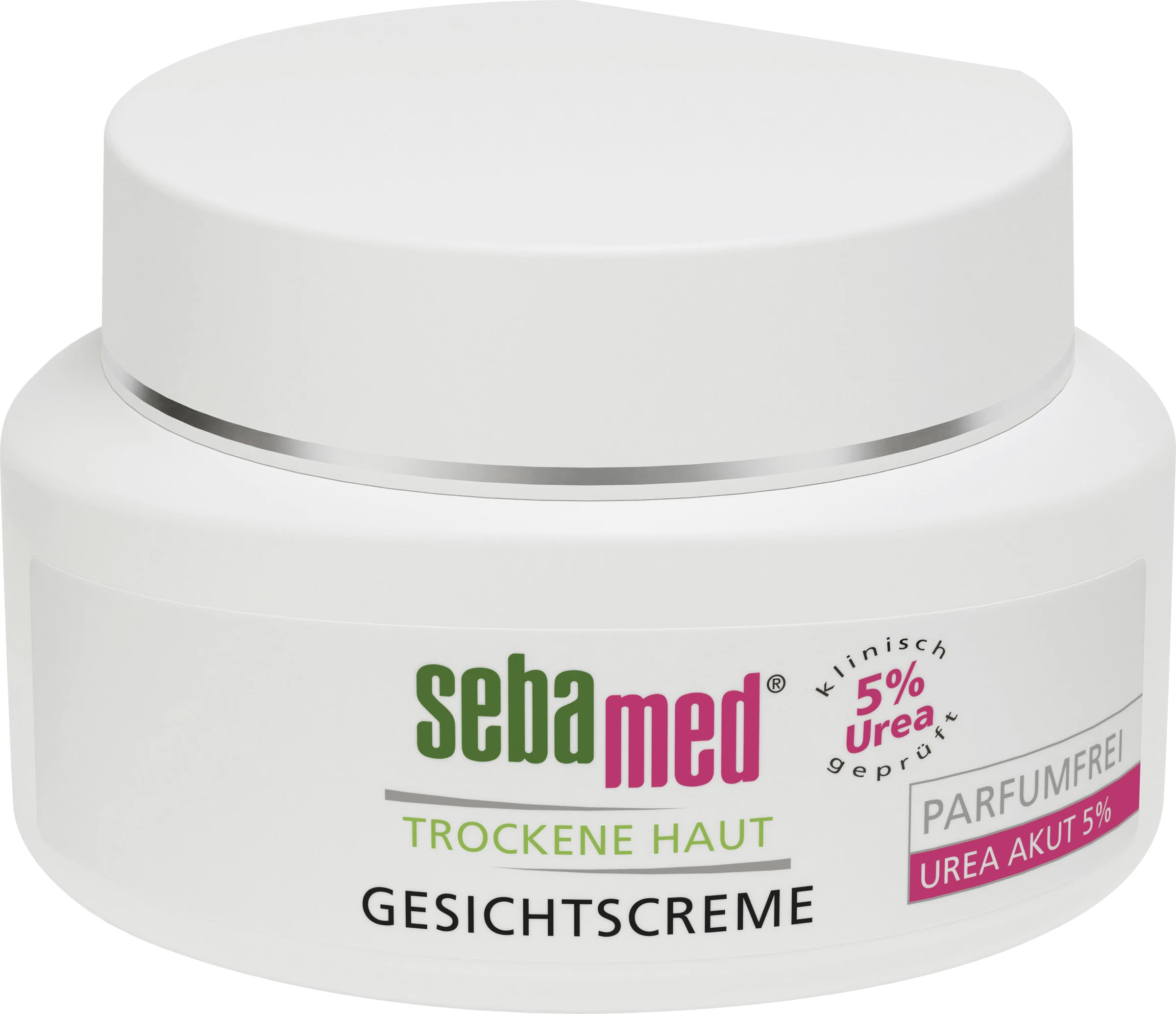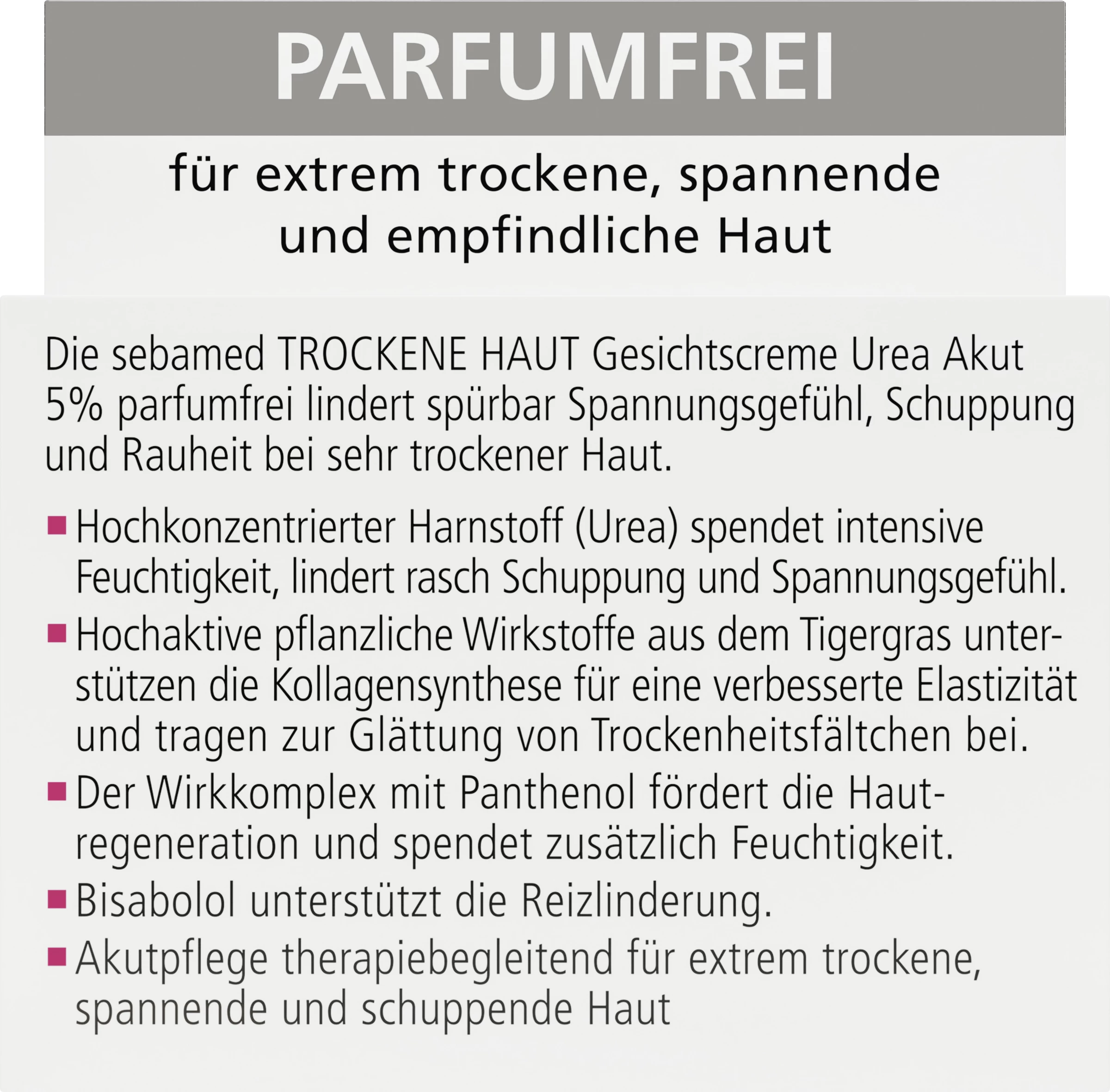 Die sebamed Trockene Haut Gesichtscreme Urea Akut 5% parfumfrei lindert spürbar Spannungsgefühl, Schuppung und Rauheit bei sehr trockener Haut.