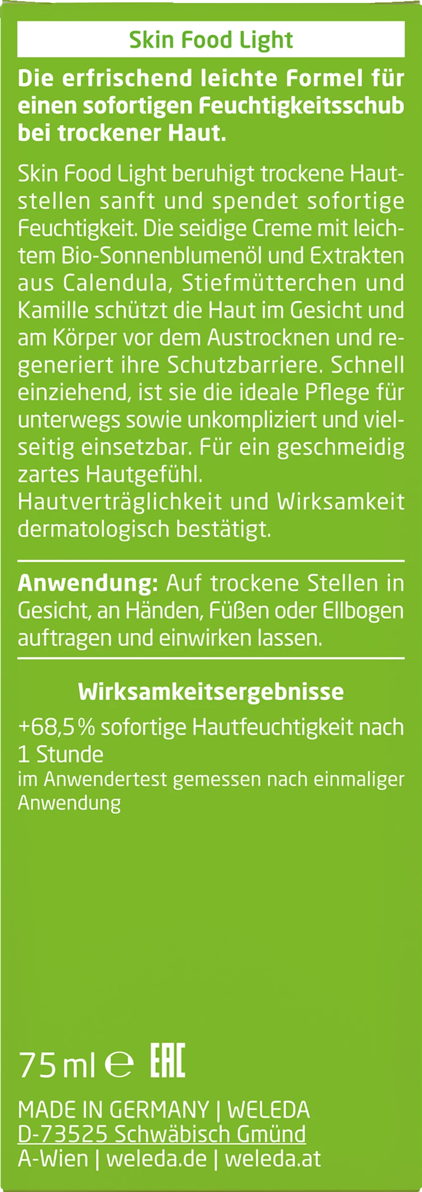 Skin Food Light stillt den Durst trockener Haut sofort und versorgt sie mit intensiver Feuchtigkeit. Die seidige Creme beruhigt die Haut mit ihrer reichhaltigen Formulierung und wertvollen Pflanzenextrakten.