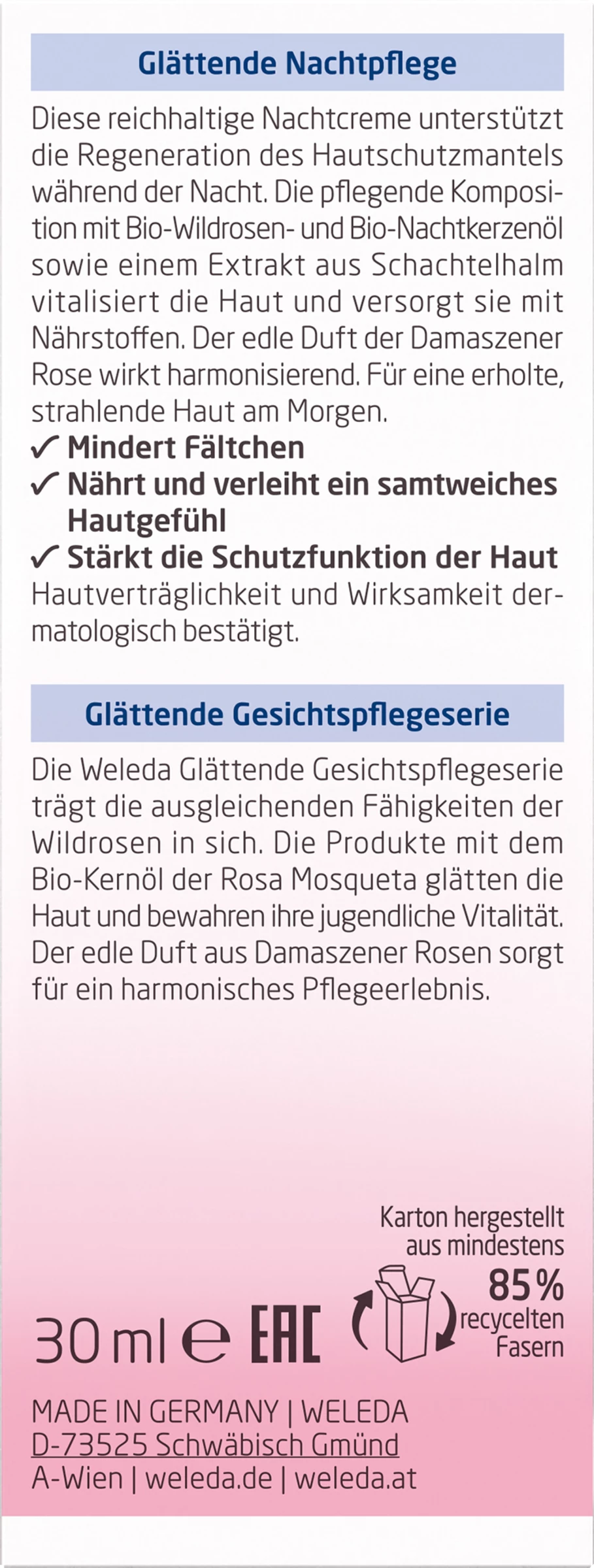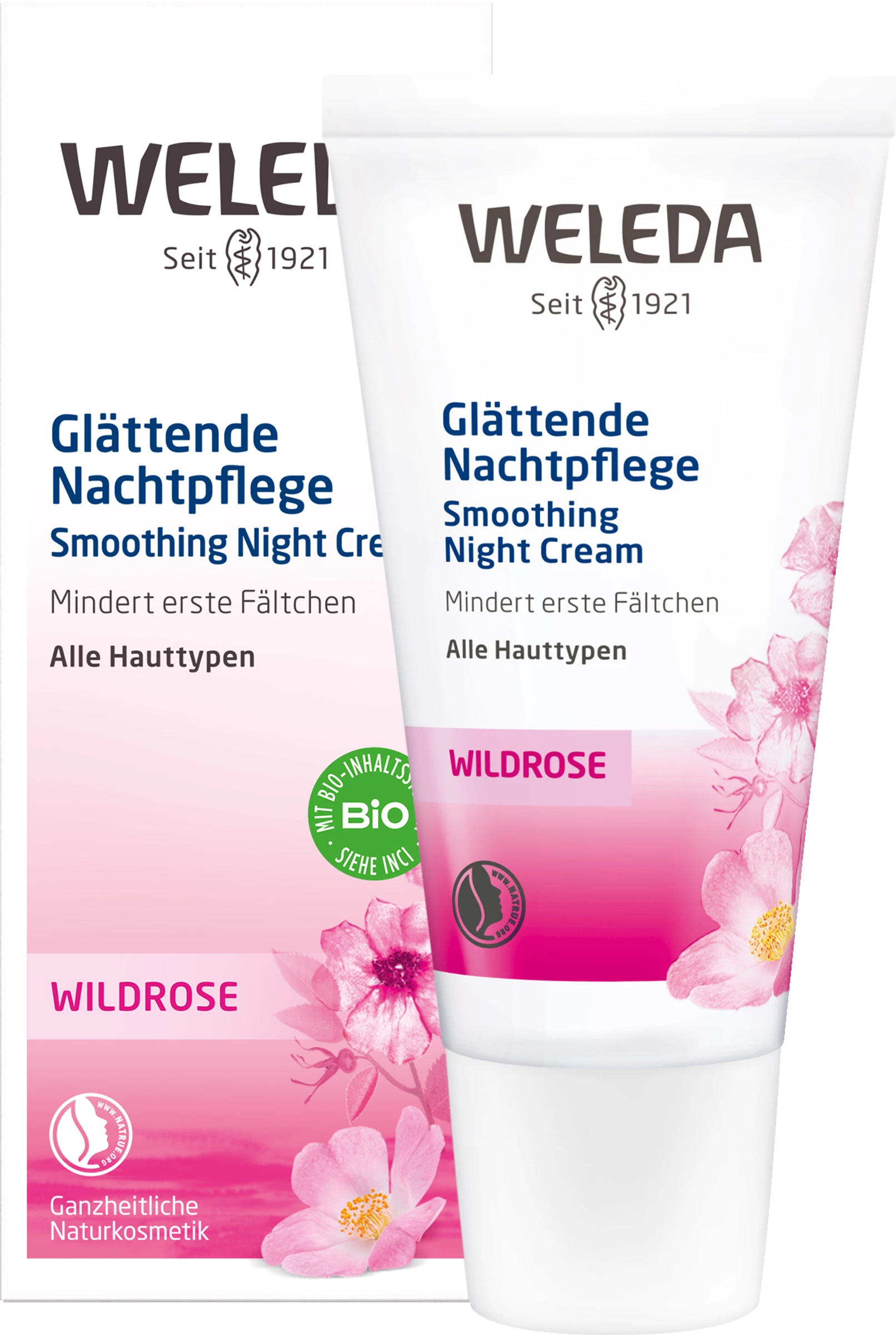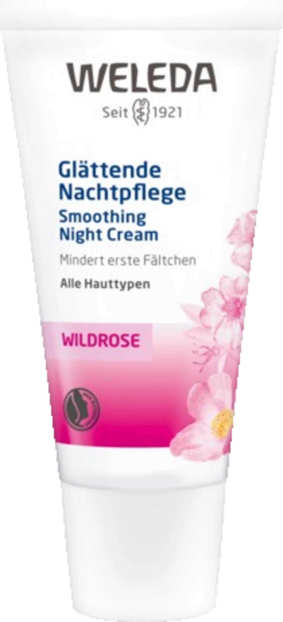 Die Wildrose Glättende Nachtpflege regeneriert die Haut, stärkt den Hautschutzmantel und mindert erste Fältchen.